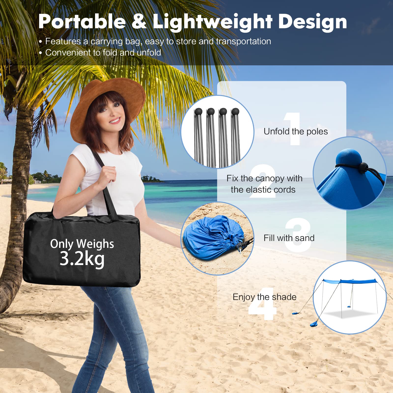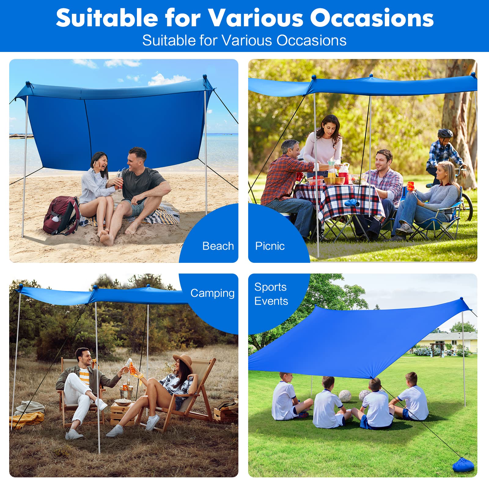 Easy Setup: The beach sunshade is easy to set up, and all you need to do is unfold the poles, then fix the canopy with the elastic cords, and then fill it with sand. More than that, you can use all 4 poles to make a taller canopy and creates a bigger usable shade area, or use just 2 poles you can customize a private relaxing sunshade zone with wanted angles.