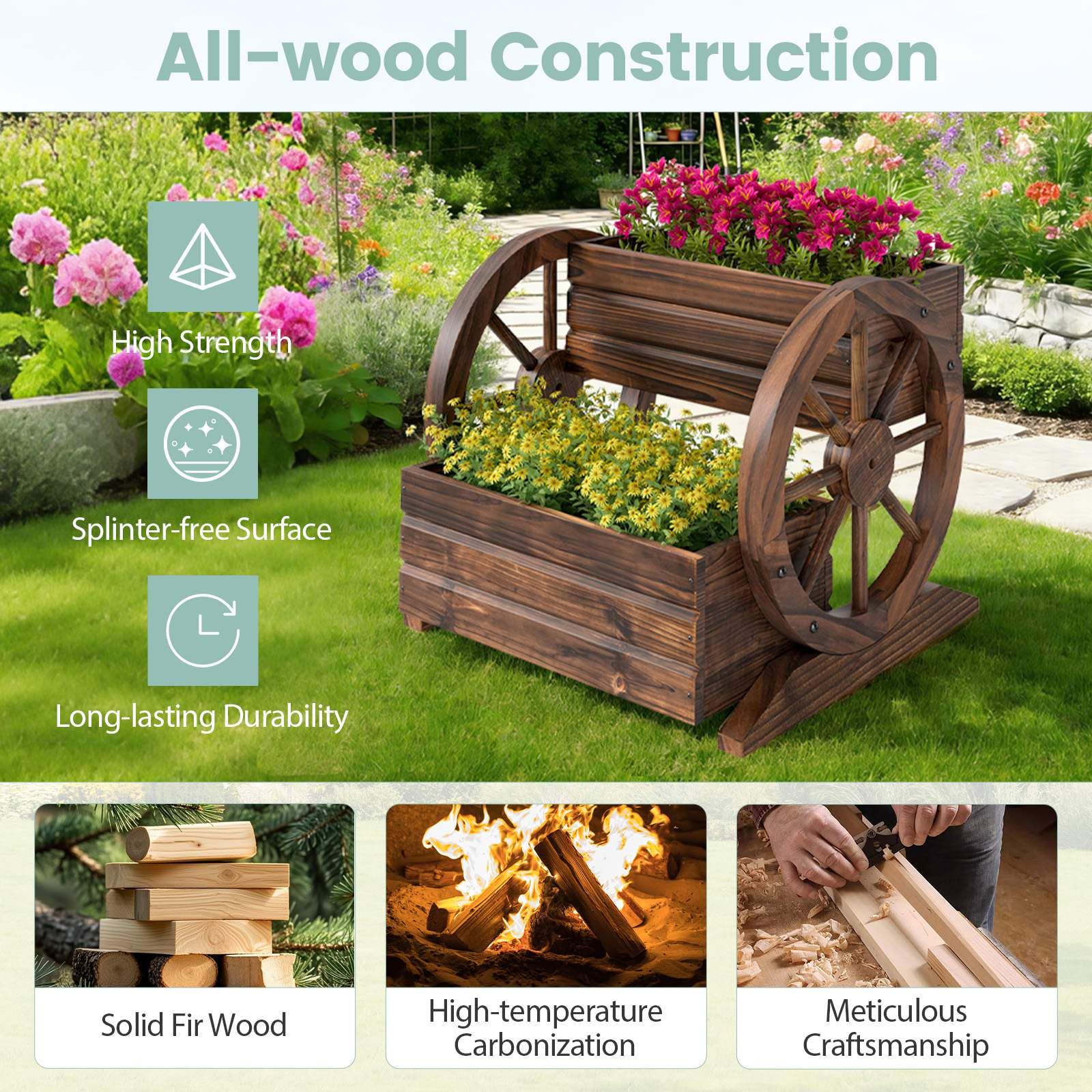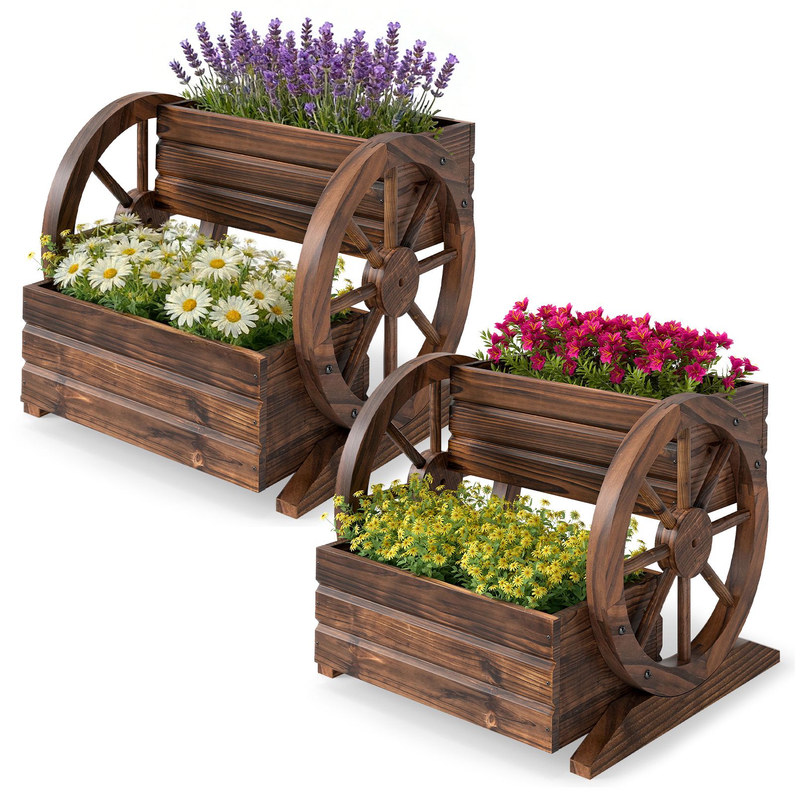 Featuring a 2-tier layout, the vertical raised garden bed offers ample room for diverse plantings, allowing you to neatly segregate vegetables, herbs, and flowers for a well-organized and thriving garden display. Expertly crafted from carbonized fir wood, the rugged construction ensures durability, while maintaining its antique charm through every season. Thoughtfully integrated drainage holes protect roots from waterlogging and foster vigorous plant growth. With its iconic wagon wheel accents and a beautifully charred wood finish, the rustic flower plant stand stands out as a striking focal point for patios, balconies, or cozy corners. Blending classic charm with everyday utility, it's also the ideal solution for showcasing potted plants or decorations.