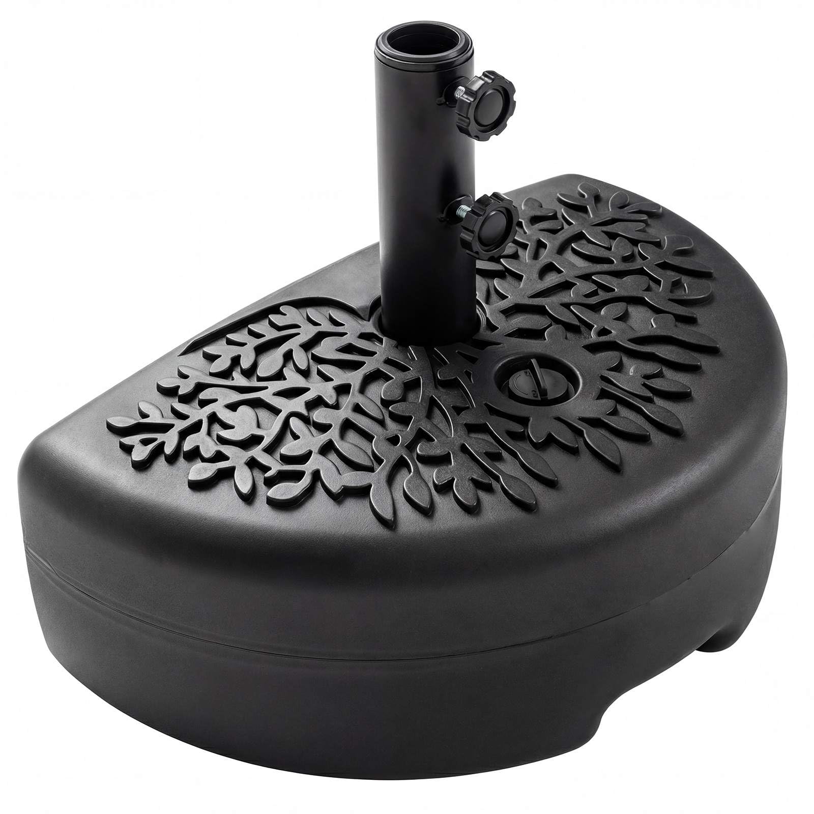 Our heavy-duty patio umbrella base offers universal compatibility with most umbrella pole sizes using 2 adapters (40/48.5 mm) and dual locking knobs, so your shade stays stable at all times. Engineered with a refillable reservoir, it can be loaded with water, sand, or a mix of both for stable weighted support. The innovative half-round shape design fits snugly against any wall to maximize patio space and features a convenient built-in handle for swift repositioning or storage. Crafted from high-quality HDPE and fortified with a strong metal tube, this unit remains waterproof, sun-proof, and reliable for years of use. Setup is quick and tool-free, and its lightweight build makes off-season storage effortless, ensuring your patio is ready for any occasion.