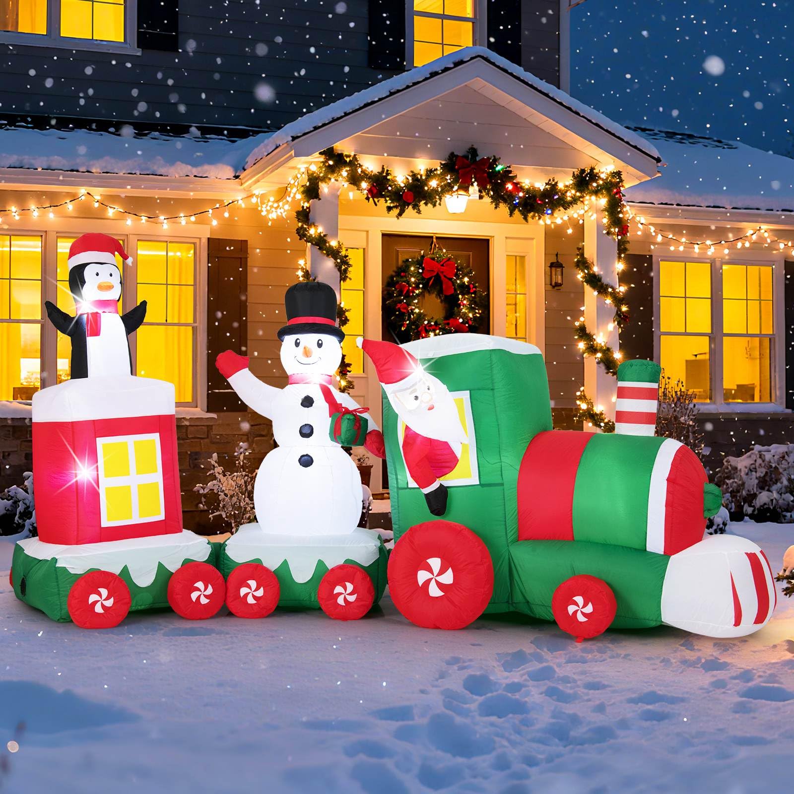 Giant Inflatable Christmas Train: This 350 cm long train featuring Santa Claus as the conductor, with a waving snowman holding a gift box and a playful penguin, bringing endless festive fun to your outdoor display or holiday event.
