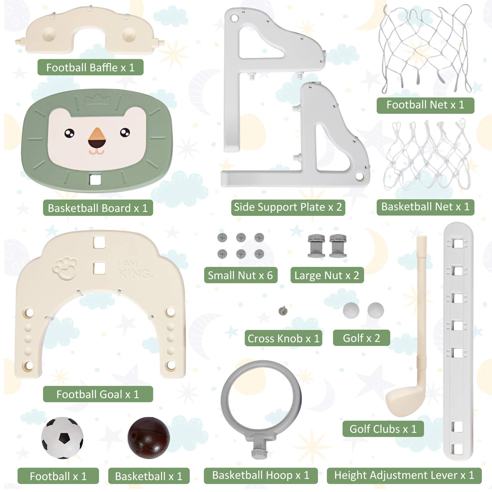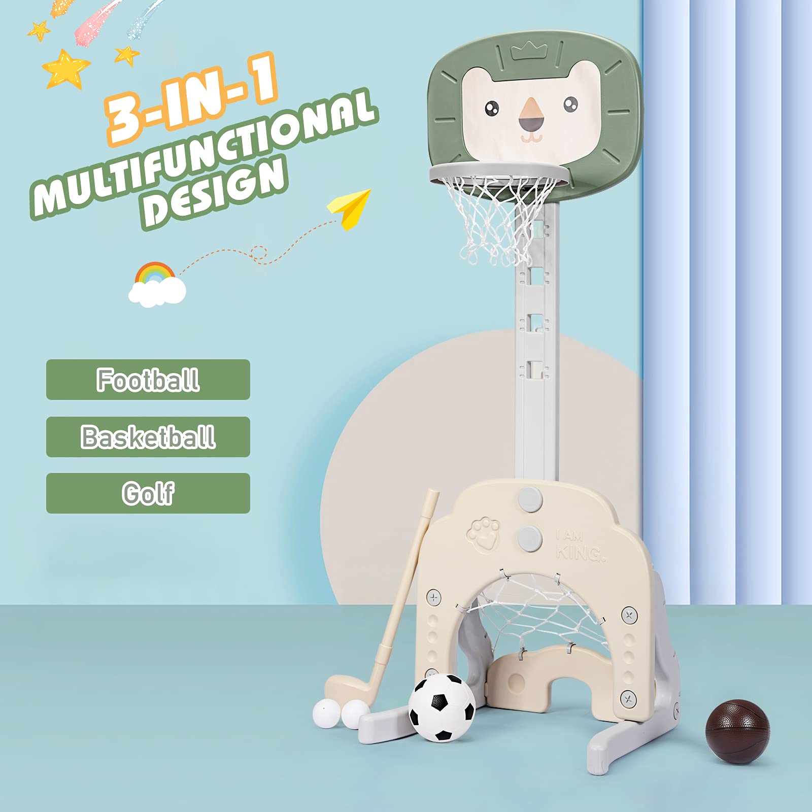 The 3-in-1 toddler basketball hoop includes golf game, basketball game and soccer goal game. Children can not only play alone but also can play together with their friends, relatives and parents to enjoy the enlightenment of our basketball hoop.