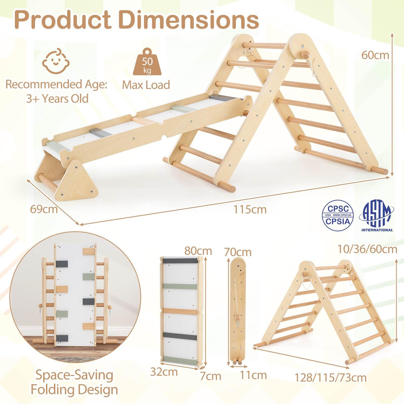 3-in-1 Versatile Fun: Explore endless adventure with this Pikler triangle set! This climbing toy is designed with a 2-sided ramp and a large triangle. Whether for climbing triangle, climbing rocks or climbing ladder, this playset will always be perfect for imaginative and active play.