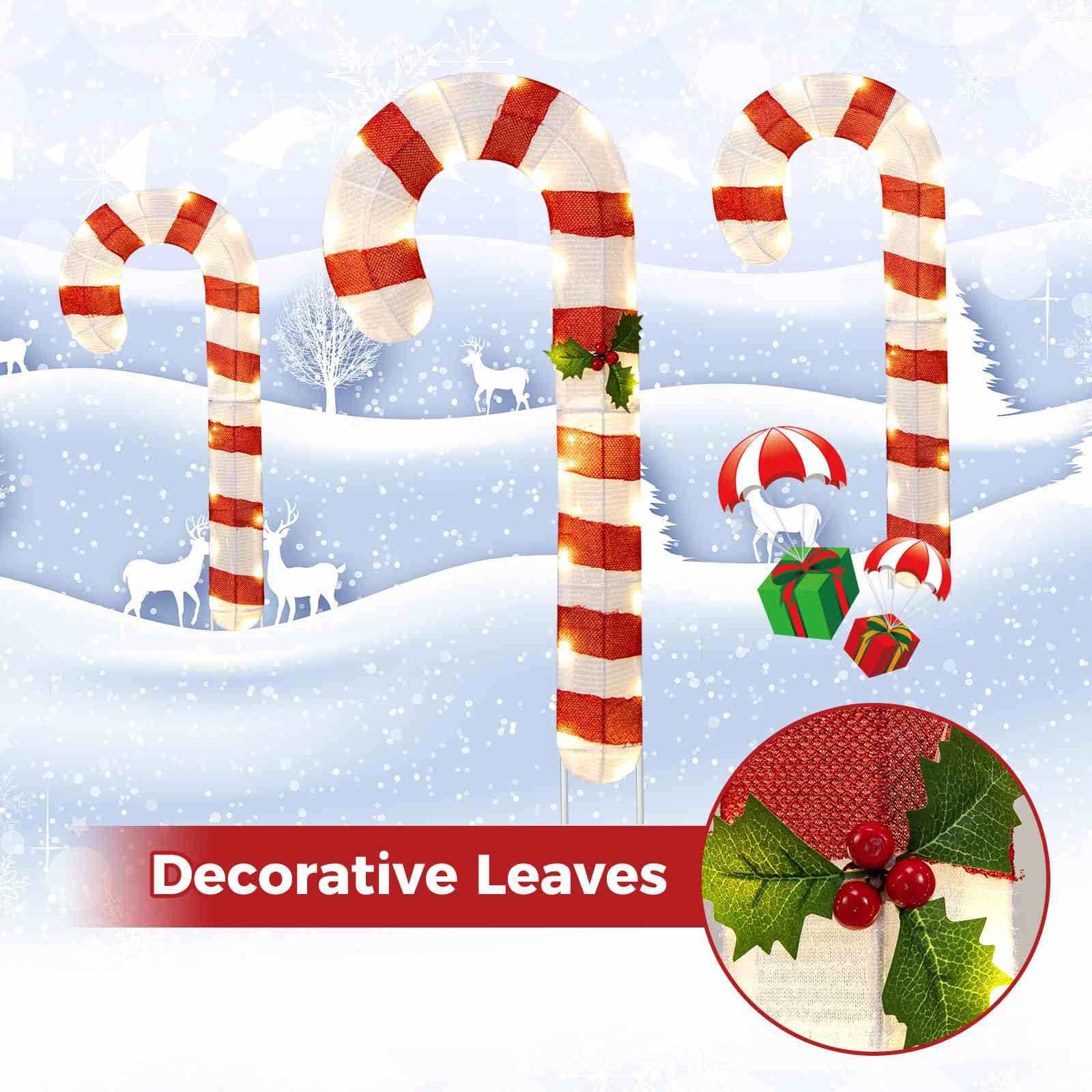 Attractive Features: Featuring a classic red and white design, these Christmas candy canes bring festive cheer to your holiday. Additionally, one of them is adorned with leaves and balls for an extra festive touch.