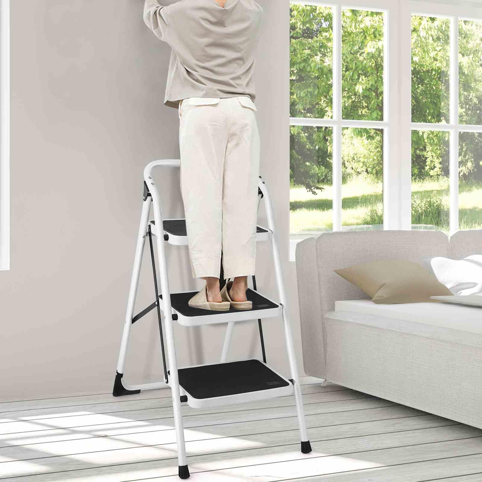 Stable Structure with Solid Connection: Delicately crafted with thickened iron material, the 3-step ladder ensures a maximum load capacity up to 150 kg. Stable triangular structure keeps it steady all the time. And sturdy rivet reinforcement ensures solid connection for enhanced reliability.