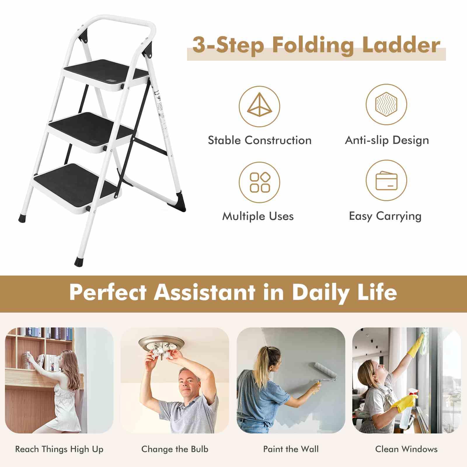 3-Tread Step Ladder with Convenient Hand Grip for Home Garage Kitchen