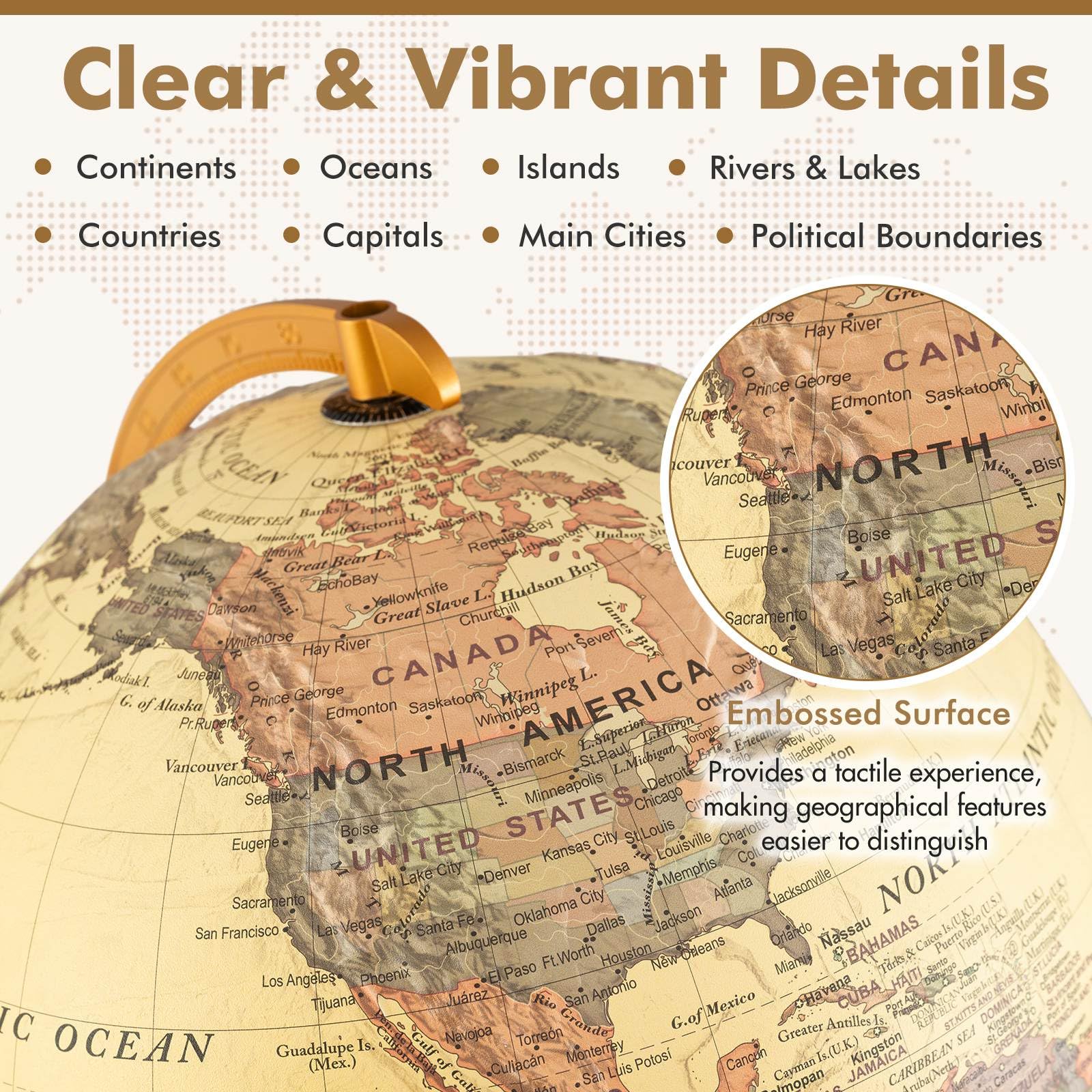 Clear & Vibrant Details: This world globe features high-definition rendering of continents, oceans, islands, rivers, lakes, countries, capitals, main cities, and political boundaries. Its embossed surface provides a tactile experience, making geographical features easier to distinguish.