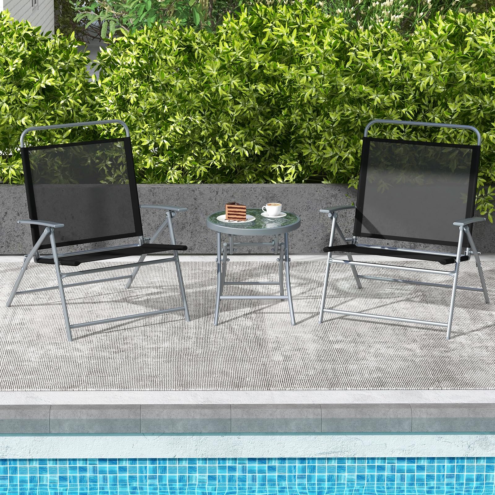 3PCS Patio Bistro Set: This 3-piece patio furniture set includes 2 folding chairs, and 1 glass coffee table, which can go well with any garden arrangement and landscaping. Each piece of this chair and table set can be used separately or in a group to be a great addition to any outdoor living space.