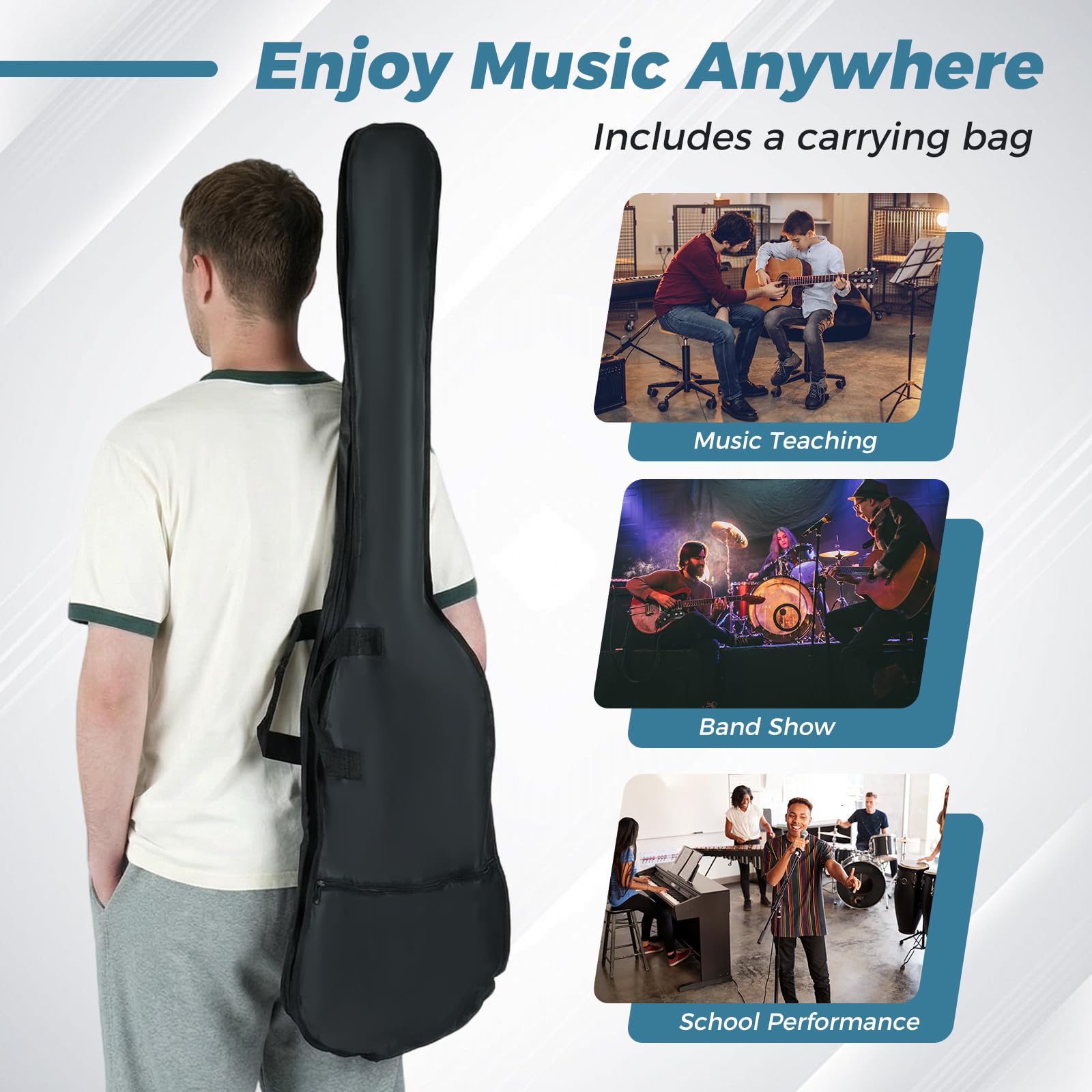Featuring 4 steel strings and smooth finish, the bass offers a comfortable and enjoyable playing experience. The dual pickup system ensures a versatile range of tones, allowing players to explore different sounds and styles effortlessly. Open-gear tuners bring precise tuning stability, making practice and performance more productive. Additionally, the complete bass guitar set comes with all essential accessories, including a gig bag, guitar cable, shoulder strap, rope, and 3 picks. Whether you're just picking up the bass or upgrading to a full-size instrument, our right-handed bass guitar kit will be a perfect choice. You can use it to join in office leisure activities, school performances, or band shows.