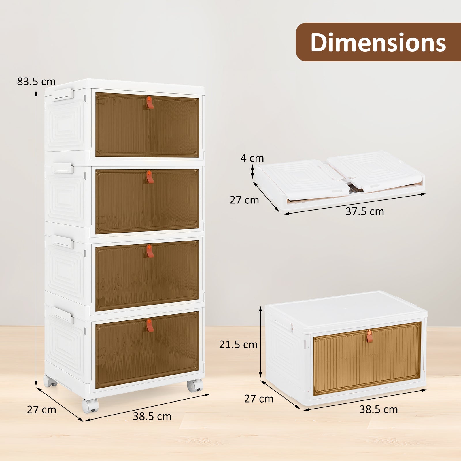 Each tier measures 38.5 x 27 x 21.5 cm, offering ample space for shoes, clothes, office supplies, or snacks. Crafted from premium PP material, these stackable storage containers ensure long-lasting use. Featuring a stackable and foldable design, they allow for flexible use and easy storage when not in use. Equipped with four 360° swivel wheels, including 2 with brakes, the folding shoe rack organizer ensures smooth movement and secure positioning. The semi-transparent front doors with magnetic catches offer easy access and visibility for quick item identification. With no tools required for assembly, these collapsible storage boxes combine convenience and versatility for efficient organization.