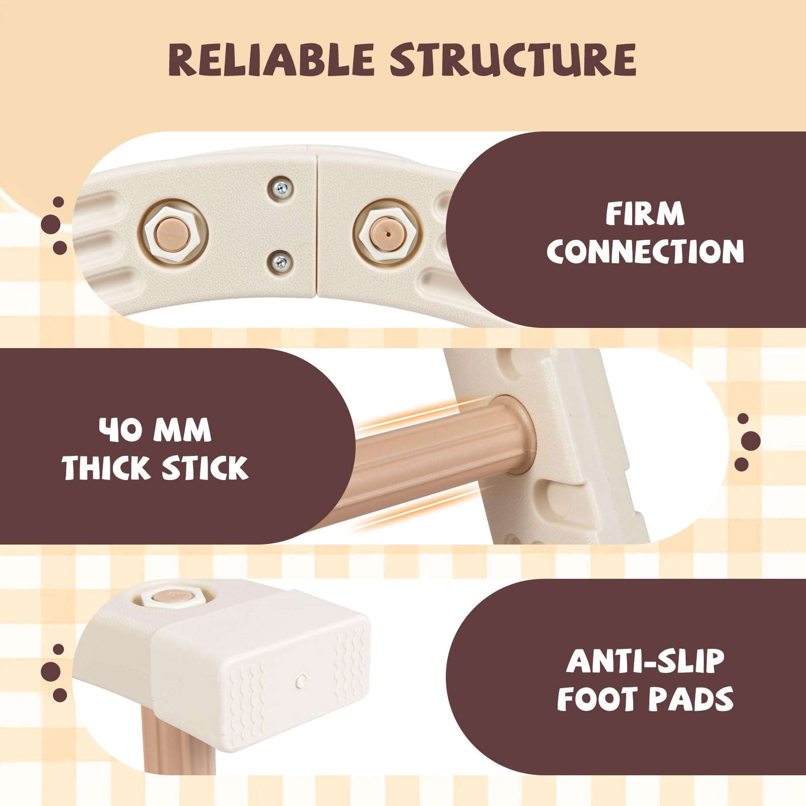 Safe Playing Environment: Designed with kids' safety in mind, this climbing toy is crafted with rounded corners and smooth surface. Meanwhile, the firm connection and 40 mm thick sticks provide overall sturdiness. There are also anti-slip foot pads to ensure the structure remains stable on the floor.