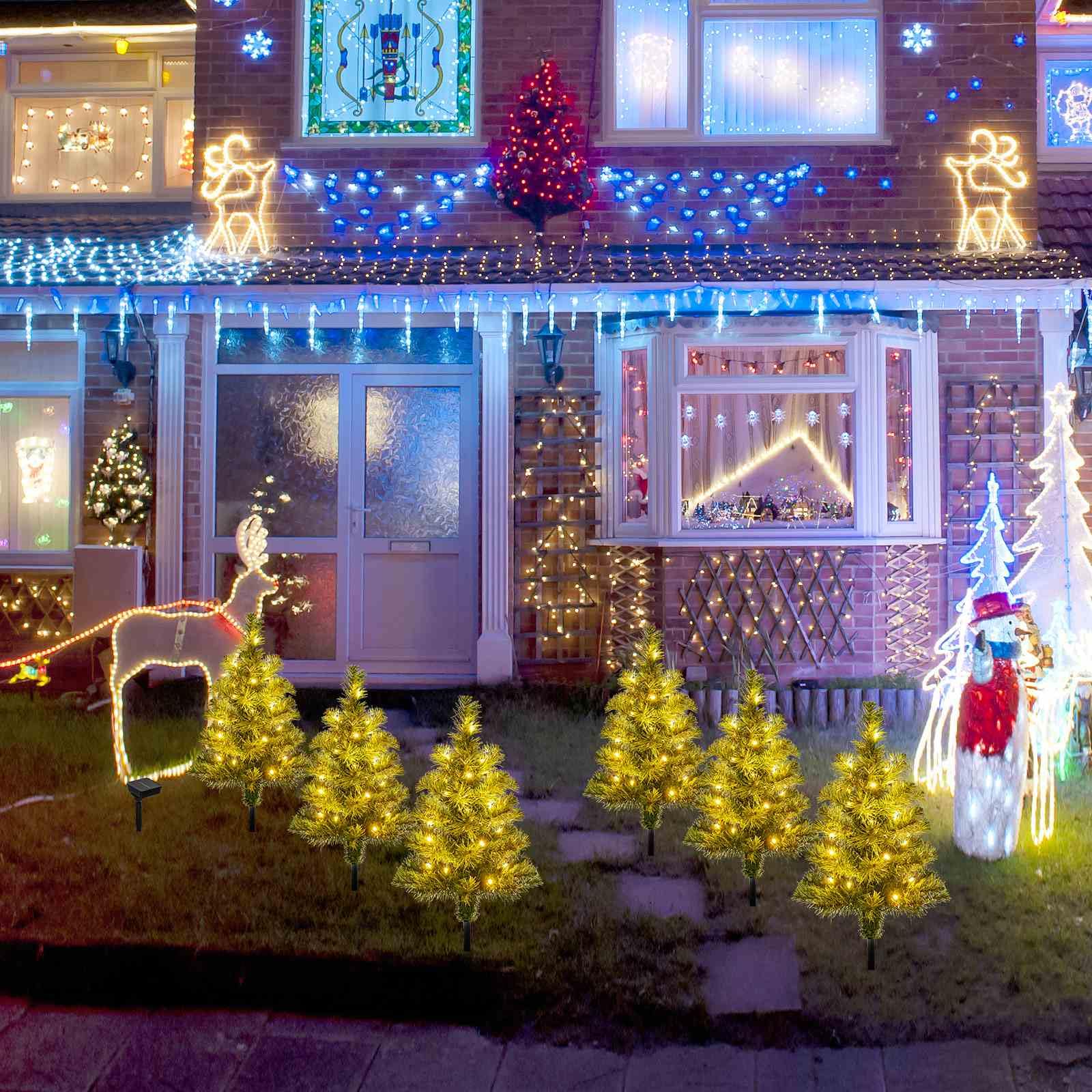 Weatherproof Design for Outdoor Use: This pre-lit holiday tree set is IP44 waterproof, snow-resistant, and frost-resistant, making it safe to use in rainy or snowy weather. It is designed for outdoor Xmas decorations, such as front yards, gardens, pathways, graves, flower beds, patios, etc.