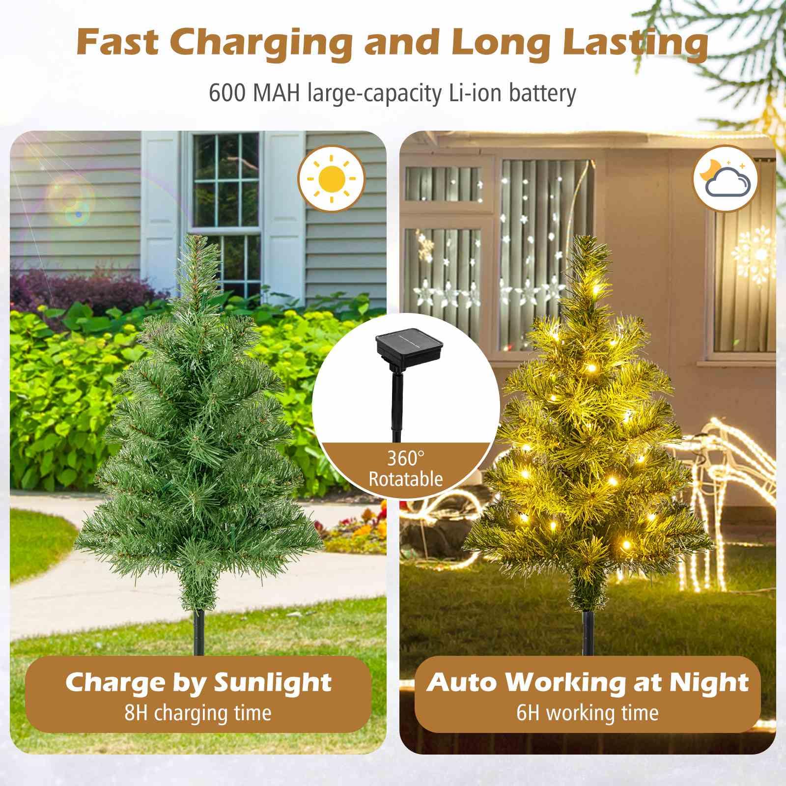 This stunning pre-lit artificial Christmas tree set that includes 6 beautifully designed mini artificial trees with 45 cm heights, which can be a perfect decoration for your garden, patio, porch, or pathway, adding a touch of holiday charm to your outdoor space. They are powered by a high-efficiency solar panel with a 600 MAH Li-ion battery, reducing the hassle of plug-in power while effectively saving energy. It could charge by sunlight with 8H charging time and auto working at night with 6H working time. Moreover, the trees are adorned with 120 brilliant LED lights that emit a warm and cozy glow, while providing 8 dynamic lighting modes for you to choose from, creating a festive and magical ambiance in your outdoor space. The leaves are crafted of flame-retardant and long-lasting PVC material, while the whole tree features an IP44 waterproof rating, ensuring durability and protection against the elements.