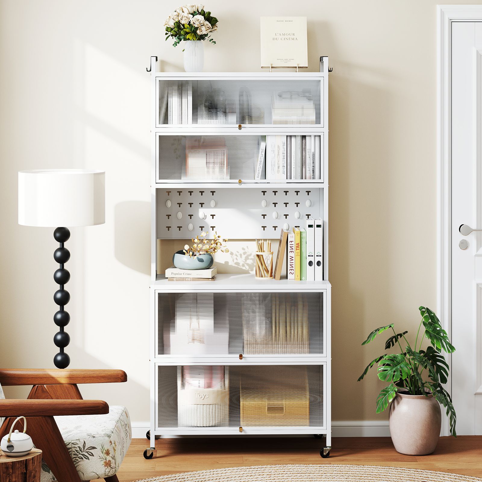 Translucent Flip Doors: The kitchen storage cabinet is equipped with translucent flip doors, allowing you to locate and access items easily. Designed for adaptability, these doors can also be detached to suit your specific storage or display needs.