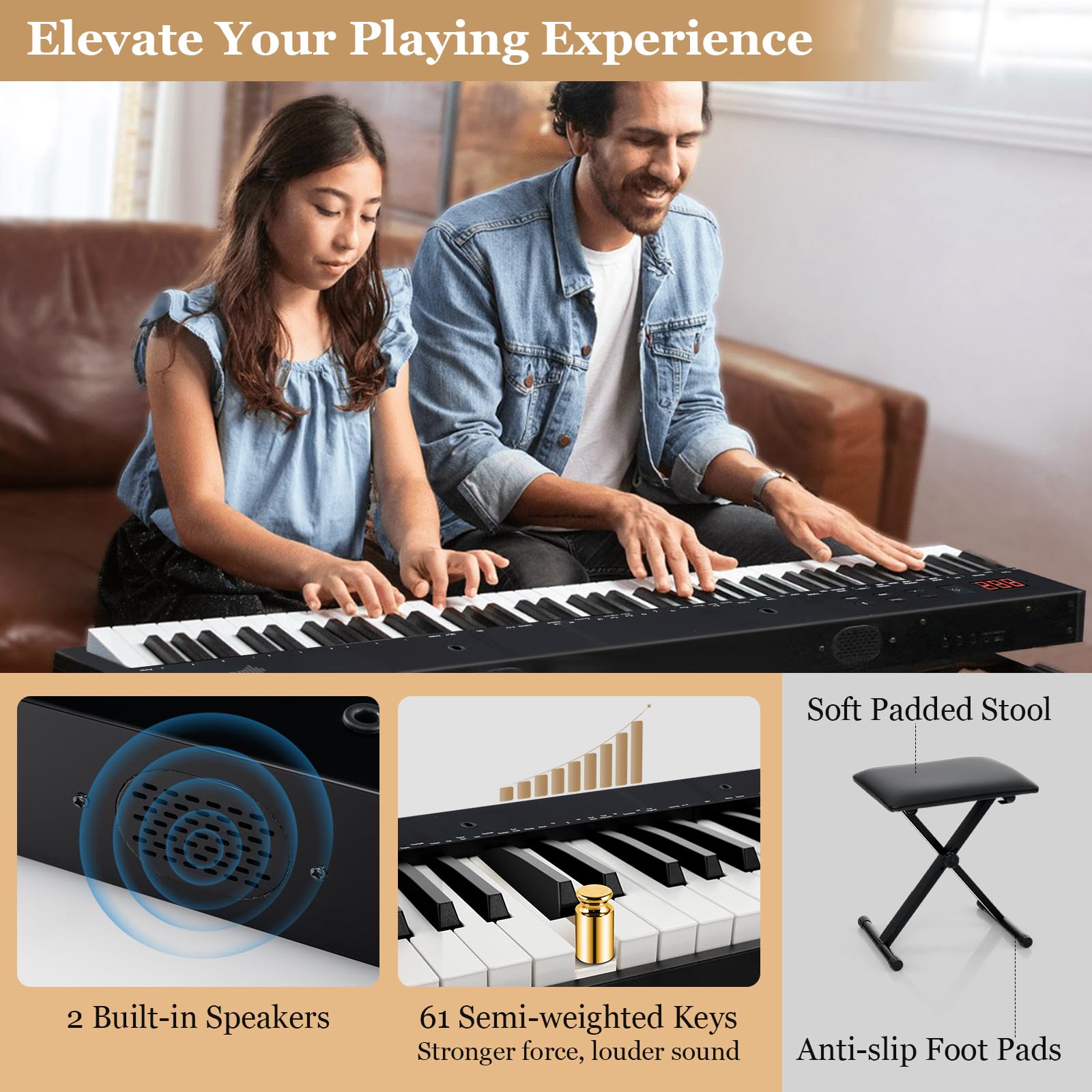 Designed for customized comfort, this digital keyboard piano comes with a height-adjustable stand and stool. And they can be easily folded up for easy storage. 61 semi-weighted keys mimic the feel of a traditional piano, complemented by 129 tones, 128 rhythms, and 30 demo songs that inspire creativity and improve playing skills. Enhanced connectivity options include Bluetooth MIDI audio functions and a variety of interfaces, such as microphone, sustain pedal, headphone and audio, enriching your musical expressions. The dual keyboard function allows 2 people to play side by side on the same keyboard. Moreover, you play the keyboard anywhere you like with the included carry bag.