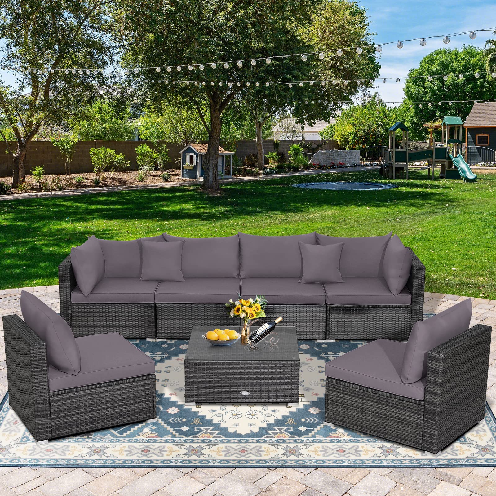 Multiple Combining Ways: This patio rattan set includes 2 corner sofas, 4 armless sofas and 1 coffee table, which can be freely combined to fit different sizes of areas. Additionally, 10 fastener clips are functional to firmly connect the sofas together. Such a comfortable and elegant sofa set is perfect for different occasions, such as the backyard, poolside and garden.