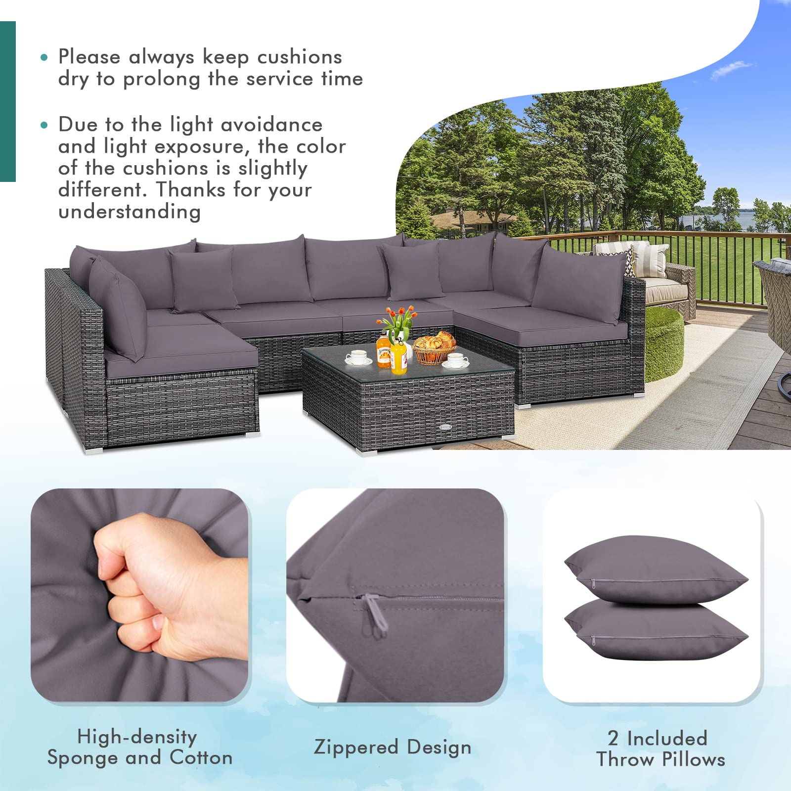 Perfect Dimensions: The dimension of the table: 72.39cm x 72.39cm x 31.75cm (L x W x H), dimensions of each armless sofa: 73.66cm x 64.77cm x 60.96cm (L x W x H), the dimension of each corner sofa: 73.66cm x 73.66cm x 60.96cm (L x W x H). Cozy Cushions & Throw Pillows: Coming with 6 seat cushions, 8 back cushions and 2 throw pillows, the patio sofas will offer you endless coziness to sit. All the cushions and pillows are filled with high-density sponge and cotton. Moreover, the smooth zippers make the cover of cushions and pillows easy to remove and wash. Note: colour differences in cushions and pillows may occur due to different lights or monitors.