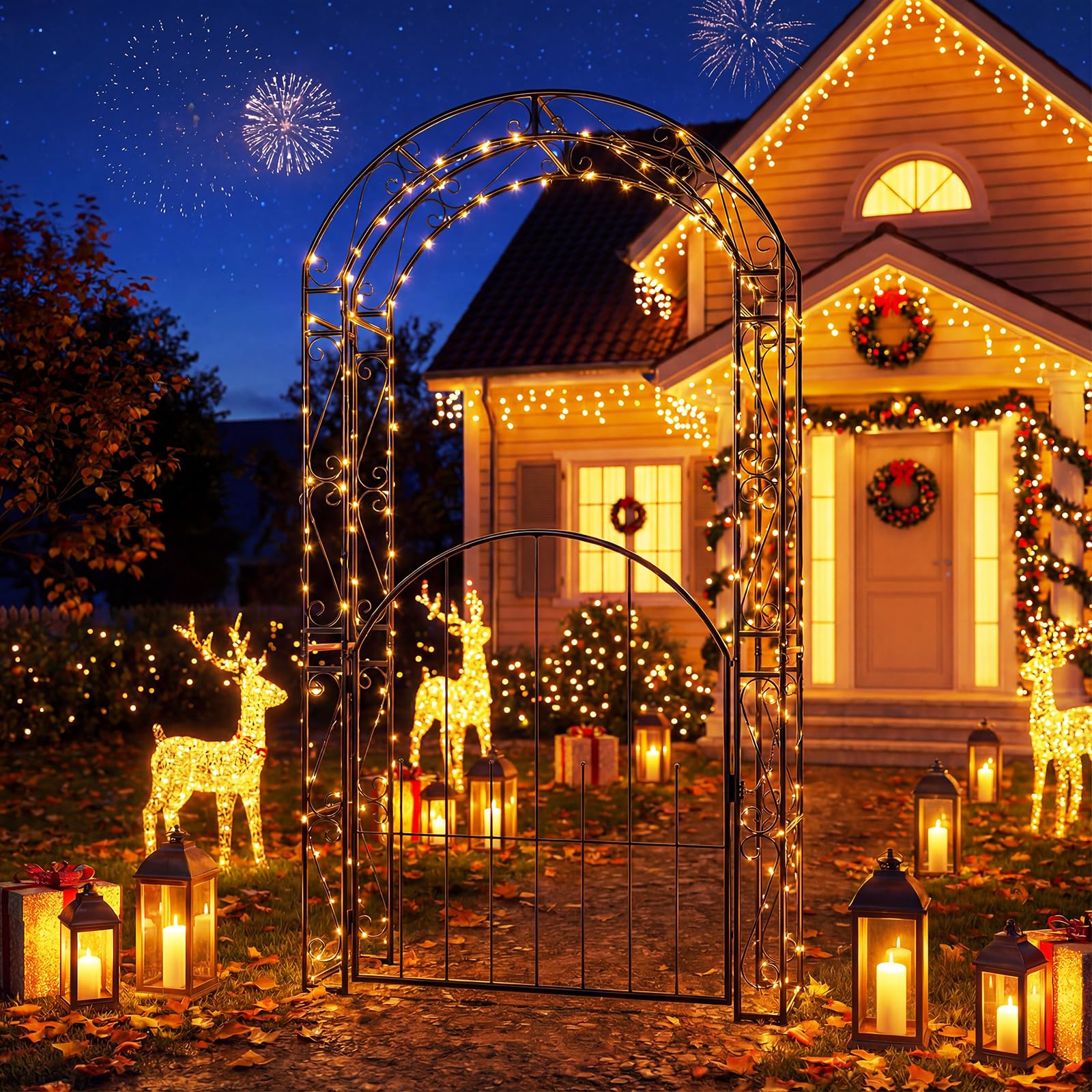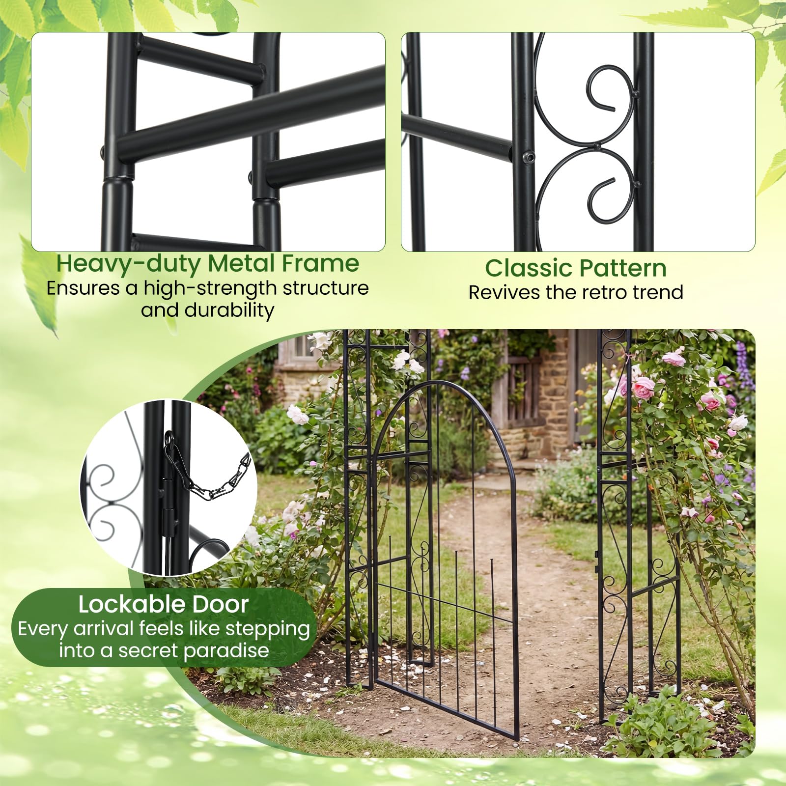 Elevate your outdoor space with this heavy-duty garden arbor with lockable gate. Crafted from powder-coated steel, it offers lasting durability and seasonal resistance. The dual trellis sides and arched top provide strong support for climbing vines, roses, and other plants, while also serving as a charming entryway for weddings, pathways, and backyard events. With its graceful detailing and spacious design, the metal archway creates an inviting focal point—transforming ordinary spaces into stunning outdoor scenes.
