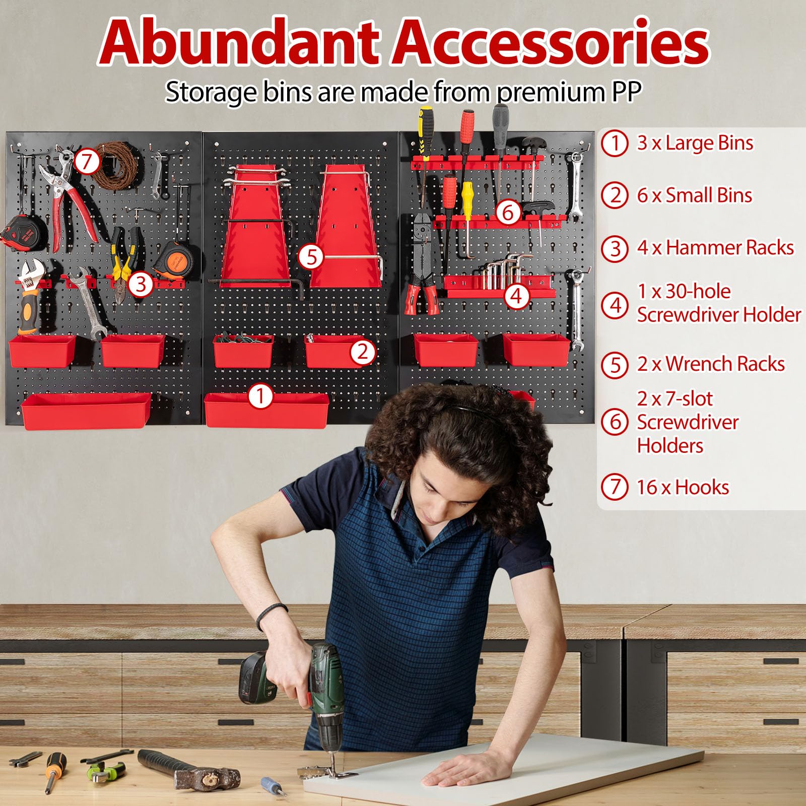 Rich Accessories: The wall organizer comes with multiple tool holders: 3 large bins, 6 small bins, 4 hammer racks, a 30-slot screwdriver holder, 2 wrench racks, 2 7-slot screwdriver holders and 16 hooks, designed to meet diverse storage needs.