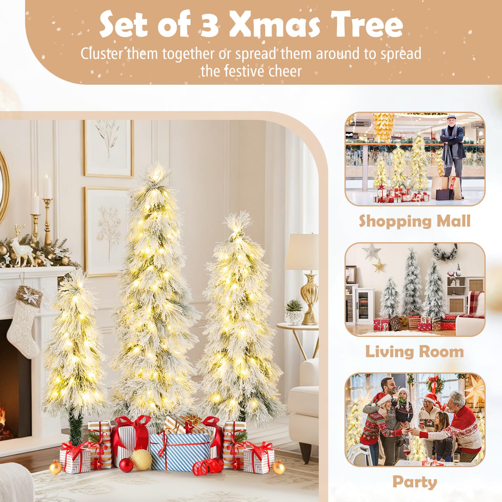 3 pieces Christmas tree set offers versatility with varying heights to customize your festive display. Users can cluster them together or spread them around to spread the festive cheer. Each Xmas tree is adorned with long pine needles to create a soft, airy appearance. In addition, 30+50+66 snow-flocked branch tips evokes the beauty of freshly fallen snow. Additionally, warm white LED lights are thoughtfully integrated, casting a cozy glow that enriches holiday ambiance. Crafted from premium PVC material, these Xmas trees are flame-retardant and are designed to last for many seasons. Plus, the included SAA-certified adapter ensures safe and reliable lighting. With festive spirit and timeless charm, the set of 3 Christmas tree is a charming addition for various occasions, including home gatherings, parties or store decorations.
