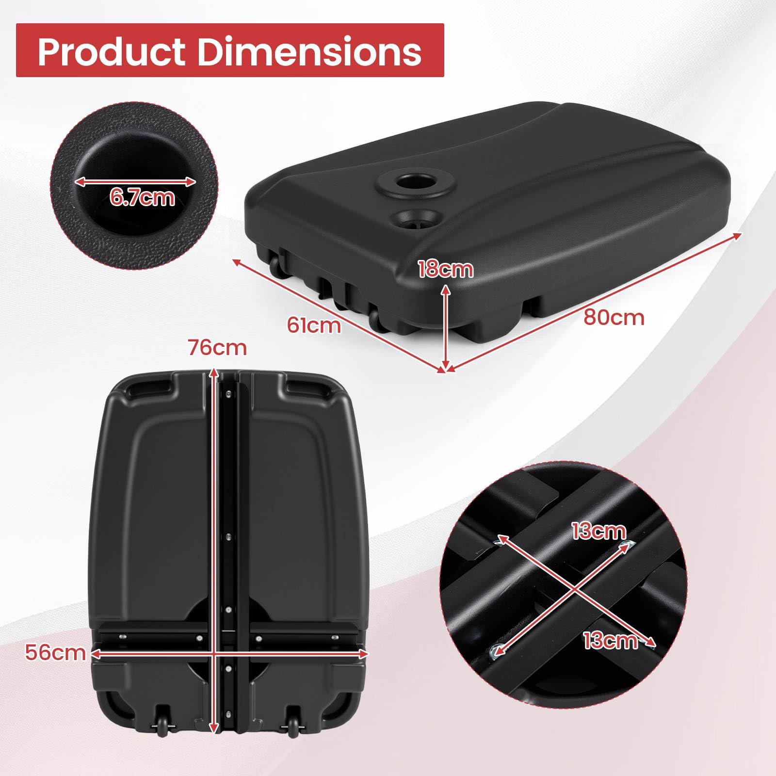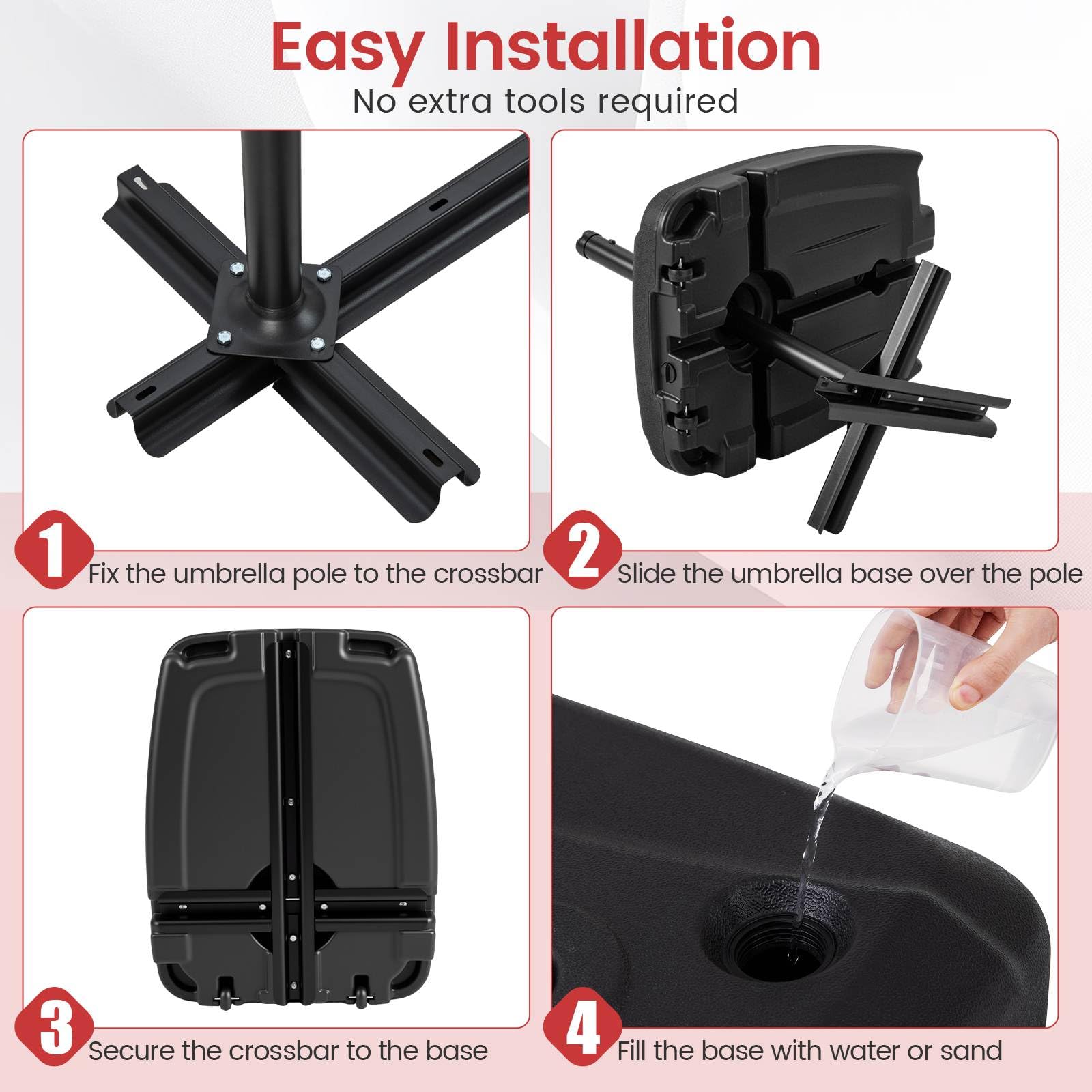 Constructed from premium HDPE, it ensures reliable durability for long-term outdoor use. It supports up to 102 kg when filled with sand and water, offering strong stability in breezy conditions. Built-in 2 flexible wheels and ergonomic side handles allow for easy movement around patios or poolside spaces. The included T-shaped cross base ensures compatibility with most offset umbrellas up to 67 mm in diameter. In addition, with a simple and tool-free setup, this umbrella base combines strength, convenience, and flexibility for daily outdoor comfort.