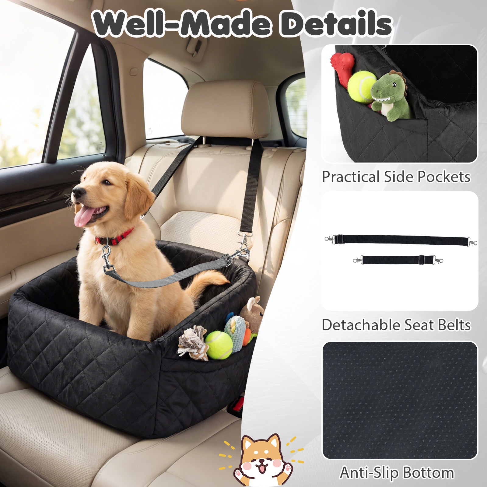 Multi-Purpose Design with Storage: Featuring practical side pockets, this pet car seat allows you to store toys, treats, or pet essentials within reach. Moreover, the seat belts can be removed and tucked away, letting the pet car seat double as a dog bed for home use, outdoor trips, or camping.
