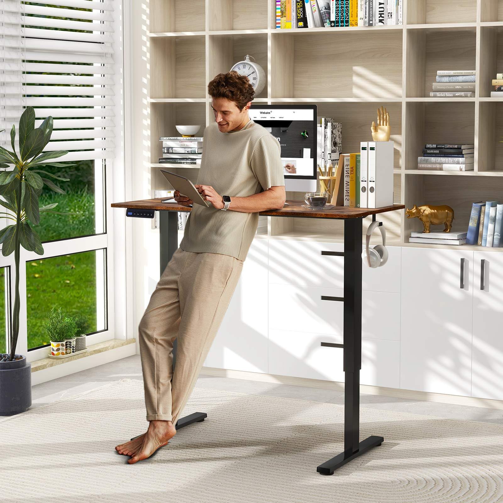 Sturdy Construction: Built for lasting stability, the stand-up desk accommodates your dynamic work needs. The solid metal legs with adjustable foot pads supports your setup without wobbling, while the powerful motor ensures whisper-quiet lifting.