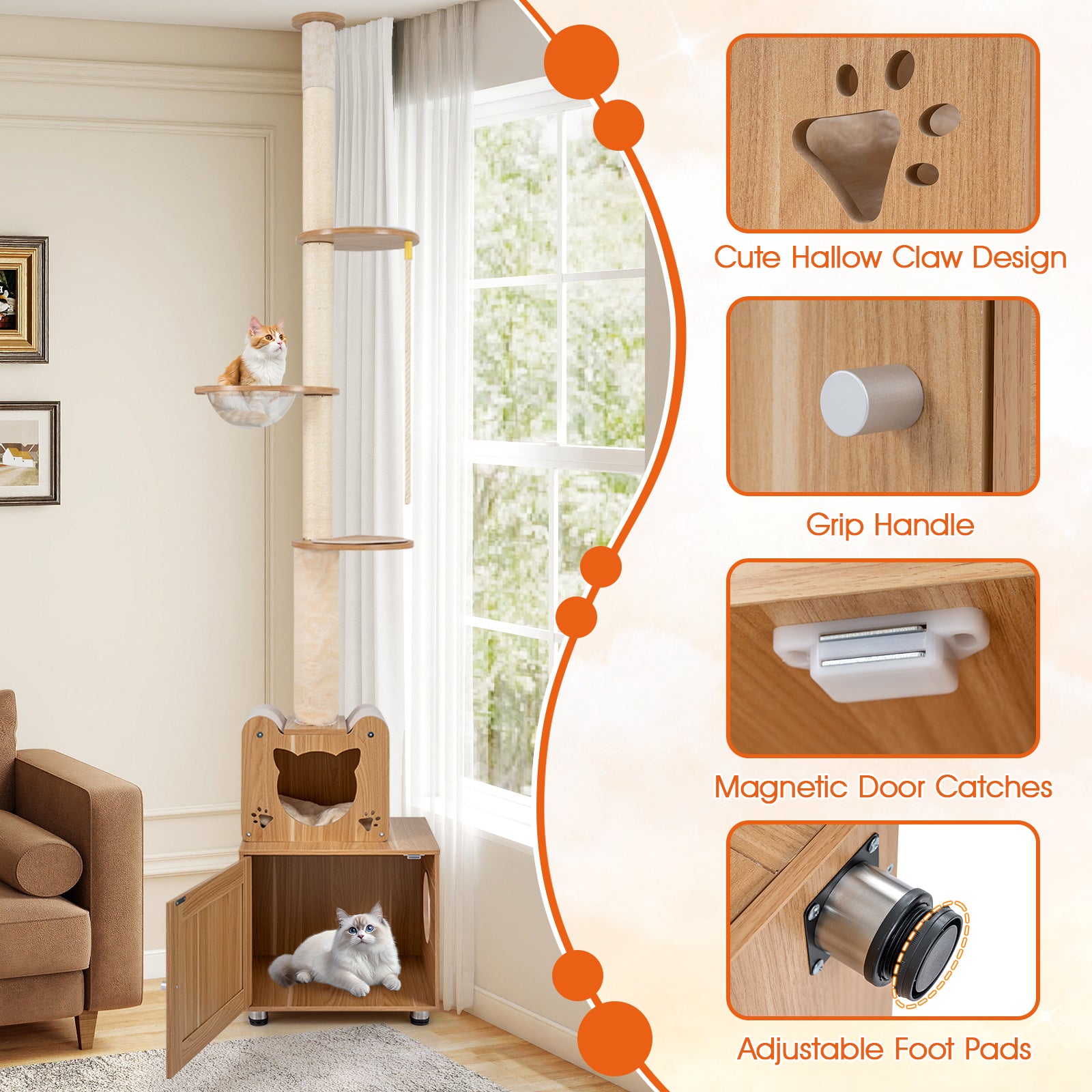The all-in-one playground for cats features a 3-level height adjustment and a manual lever for precise fine-tuning, ensuring a perfect fit for your ceiling. The height adjustable floor-to-ceiling cat tree includes a multipurpose cat cabinet, which creates a hidden litter box area that effectively contains smells and minimizes mess. Also, it can double as a cat house, which will provide a private sanctuary for cats. Moreover, the charming condo features breathable line fabric and a plush padded cushion, creating an inviting lounge spot for felines. A space capsule lets you watch your cats play or nap. Plus, fully wrapped sisal scratching posts fulfill their natural clawing instincts. Furthermore, 2 platforms with non-slip mats and sisal rope encourage energetic climbing and jumping. Delivering solid stability, the built-in adjustable foot pads will keep the tall cat tower stand stably on uneven surfaces.