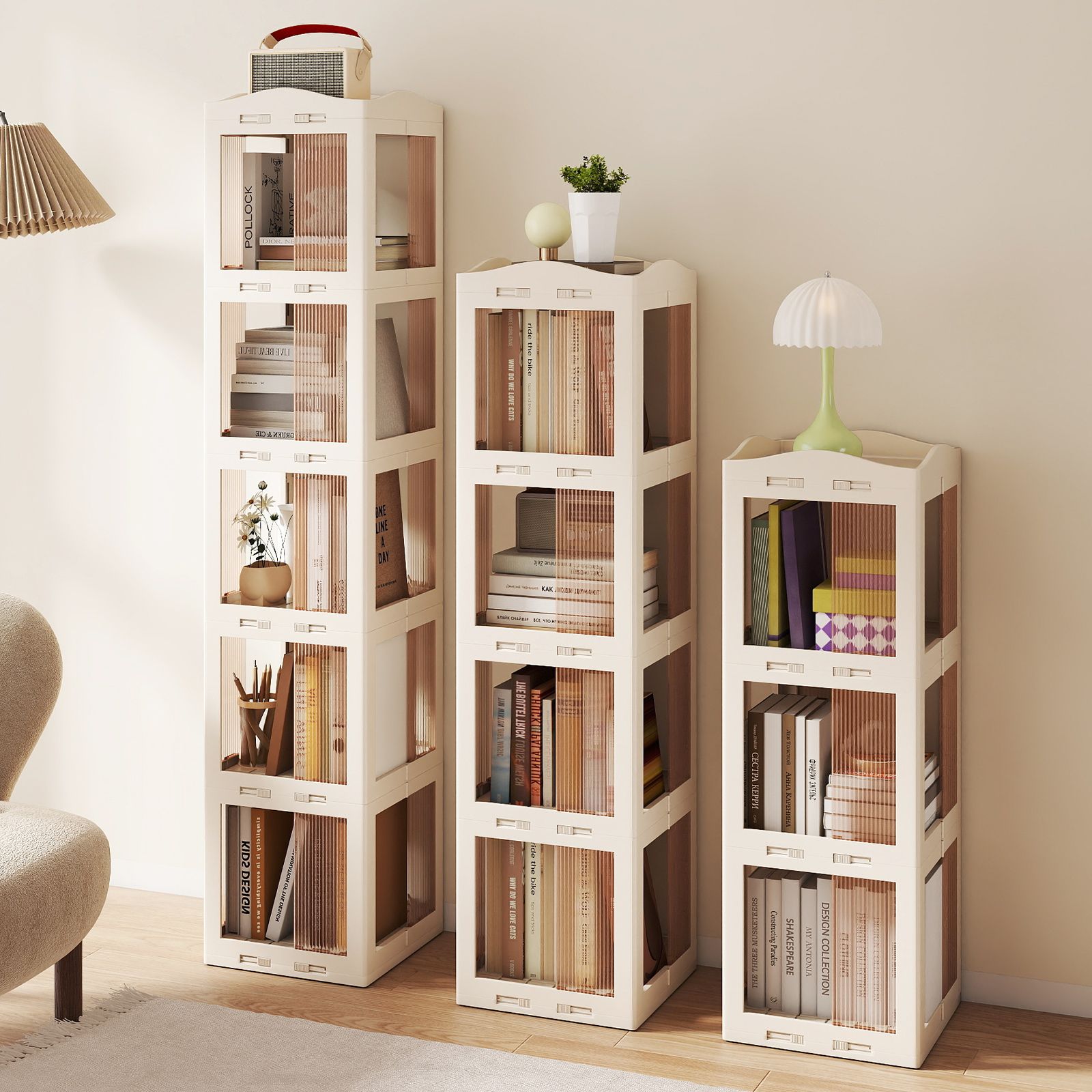 Featuring a 360° swivel base, this bookcase allows for smooth rotation, enabling you to browse your collection effortlessly from any angle. Its foldable structure adds versatility, making it convenient to store when needed. Crafted with translucent panels, this storage organizer blends subtly into your space. The corner-friendly shape helps utilize often overlooked spaces, making it a practical choice for various spaces where efficient storage solutions are essential.