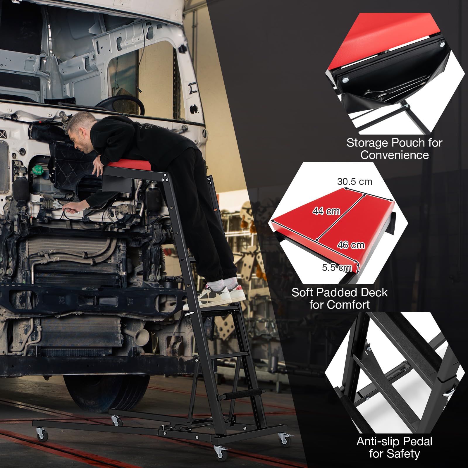 Featuring 4 swivel casters, including 2 with steadfast brakes, this mechanic creeper promises smooth maneuverability and secure positioning. Then, you can adjust the height from 114.5-168 cm and select the suitable angle, ensuring easy access to lofty engine bays without straining. Additionally, the soft padded deck and wide stepping platform ensure extended comfort during long repair sessions. The tool pouch keeps your tools handy, streamlining your workflow. When not in use, the foldable design allows for space-saving storage.