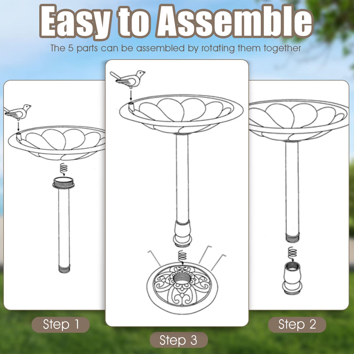 Exquisite Decor Outdoor: Featuring a vivid bird ornament and retro patterns, the birdbath stands out with its exquisite and antique look, which is a perfect decoration for your garden, terrace, lawn, etc. Simple in structure, the birdbath is assembled together in minutes without extra tools. Lightweight and compact, you can easily move it from one place to another.