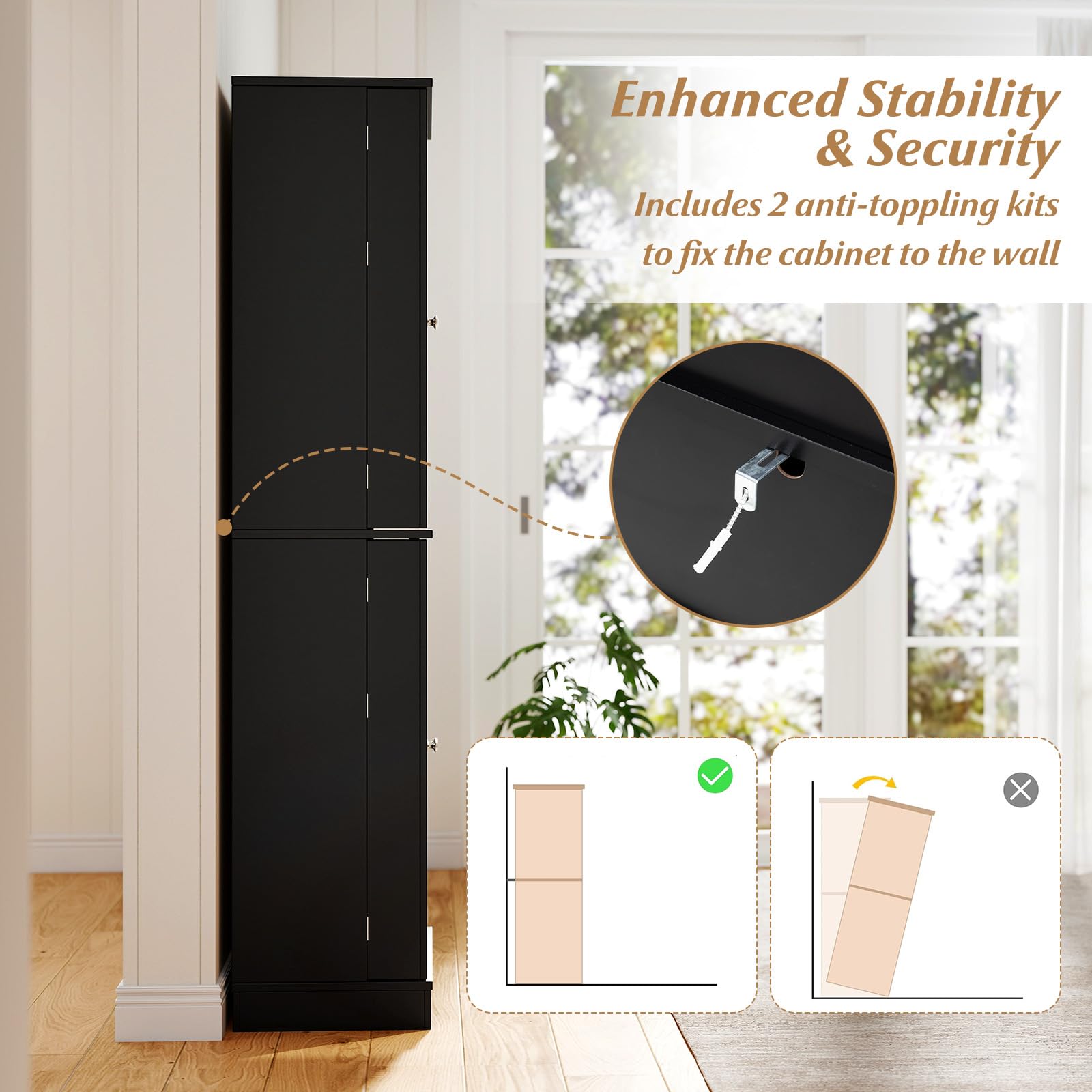 Featuring two 4-tier cabinets with doors, this freestanding tall cupboard offers extensive space to store your items neatly and out of sight. Inside, 16 door shelves provide easy access to smaller items, enhancing the convenience of organizing spices, jars, or condiments. Additionally, the kitchen pantry cabinet includes 6 adjustable shelves that allow you to customize the storage to fit items of various sizes. Crafted for stability and safety, it is equipped with 2 anti-toppling kits. Whether placed in your kitchen, dining room, living room, laundry or bathroom, this floor storage cabinet is a perfect solution for maintaining a tidy and organized space.