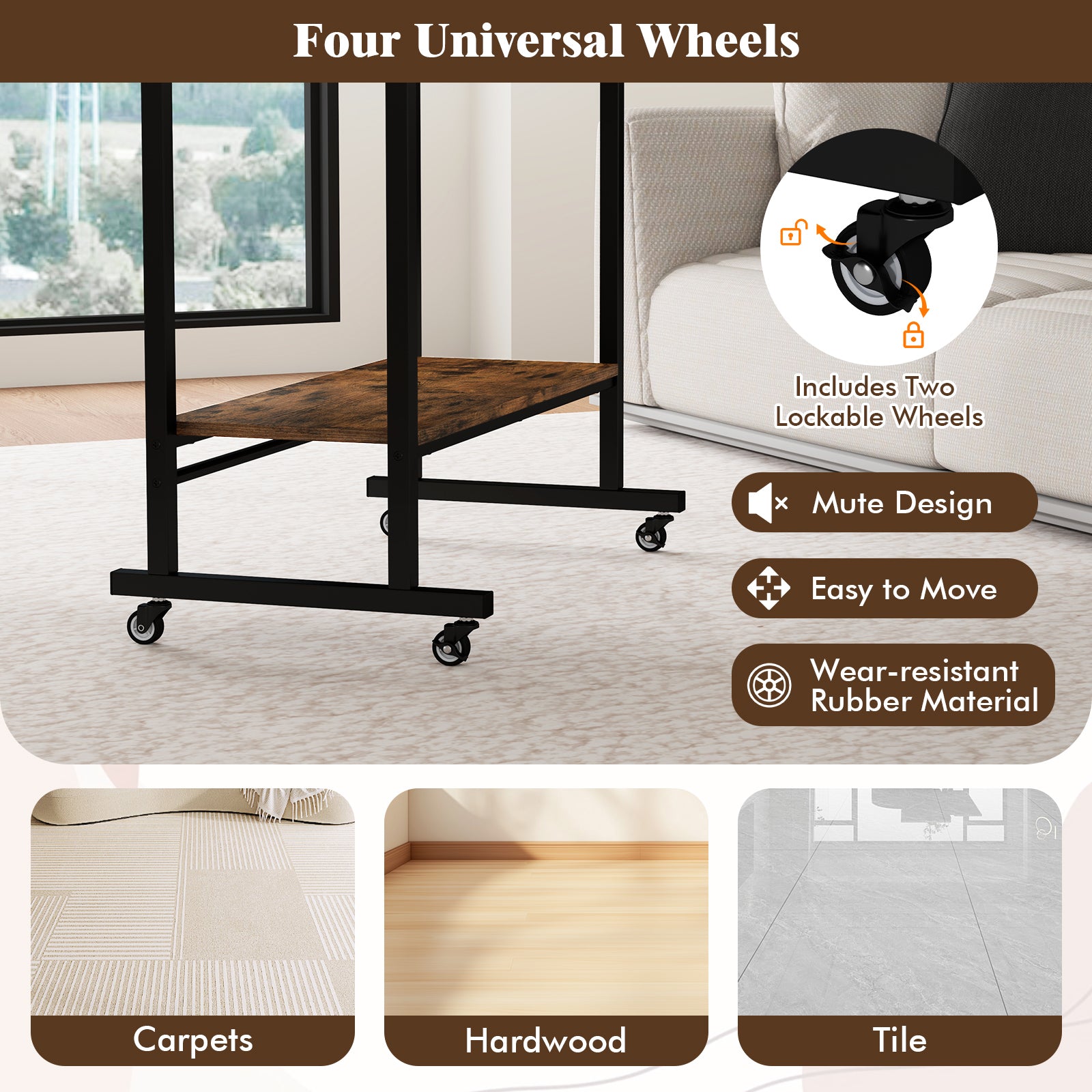 - Equipped with 4 rolling casters for easy movement
