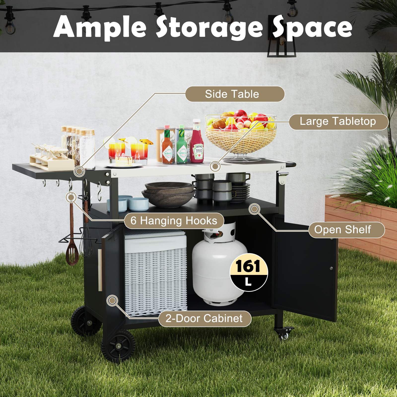 Ample Storage Space: This grill cart features a large tabletop, an open shelf, a 43 gal two-door cabinet and 6 hanging hooks, perfect for storing grilling tools, condiments, and accessories. Keep everything you need within reach for a seamless cooking experience.