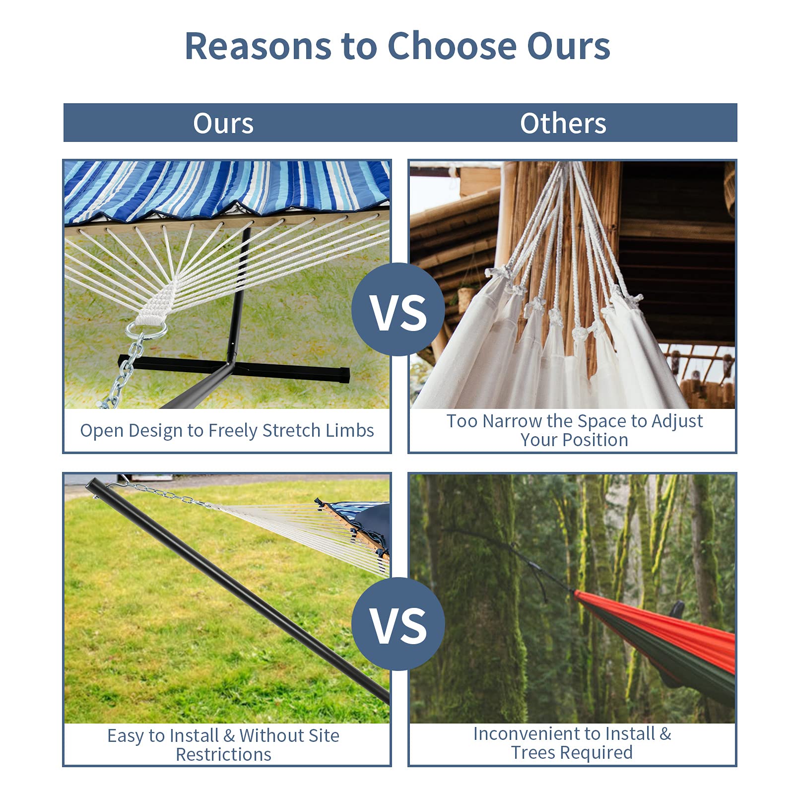 Heavy-Duty Steel Hammock Stand: Our hammock stand is made of premium thick steel pipes with coated surface, make it durable and sturdy. The wide base with anti-skid feet will increase the overall balance.