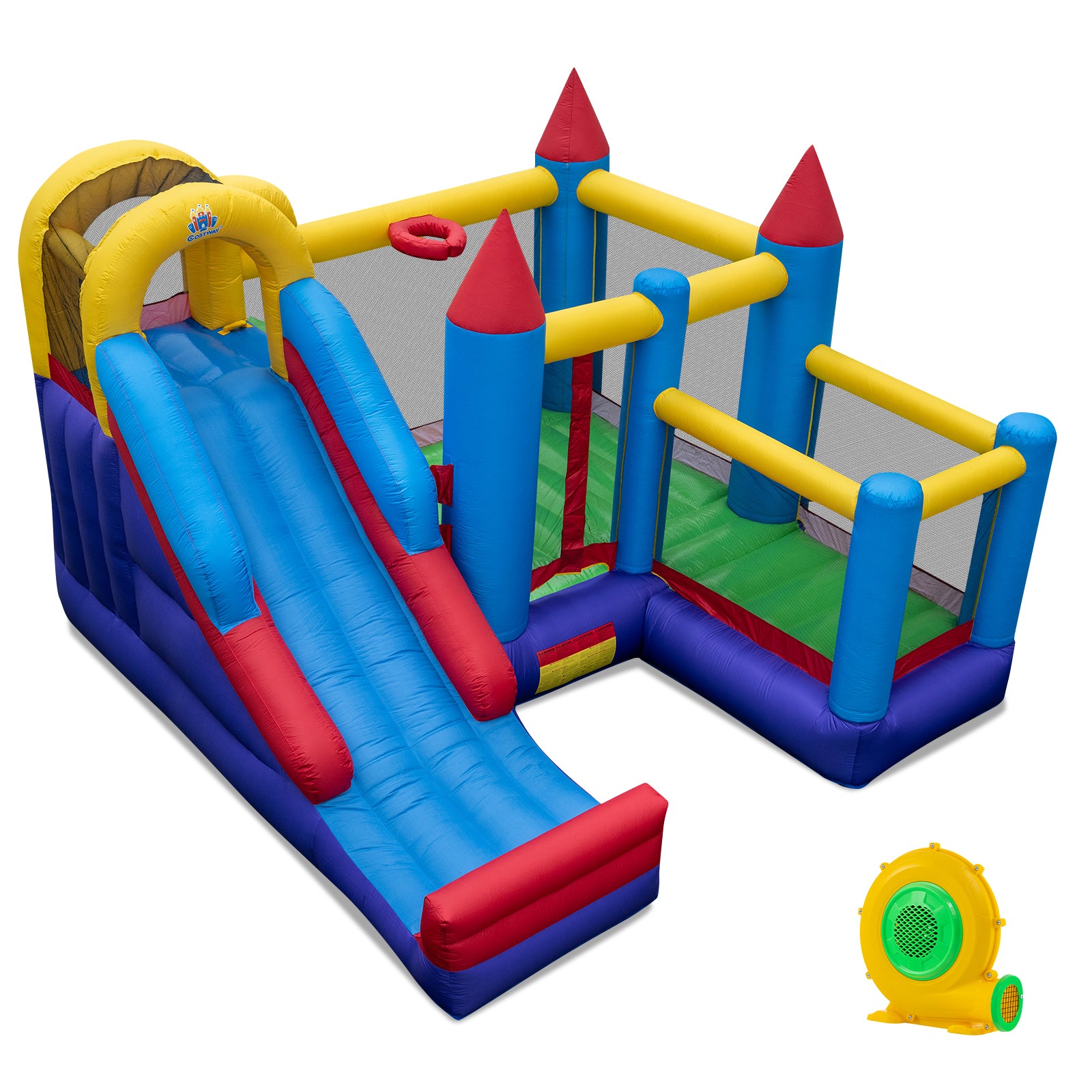 Inflatable Kids Bouncy House, Jumping Castle Trampoline, w/Slide, Jump Area, Climbing Wall, Basketball Hoop