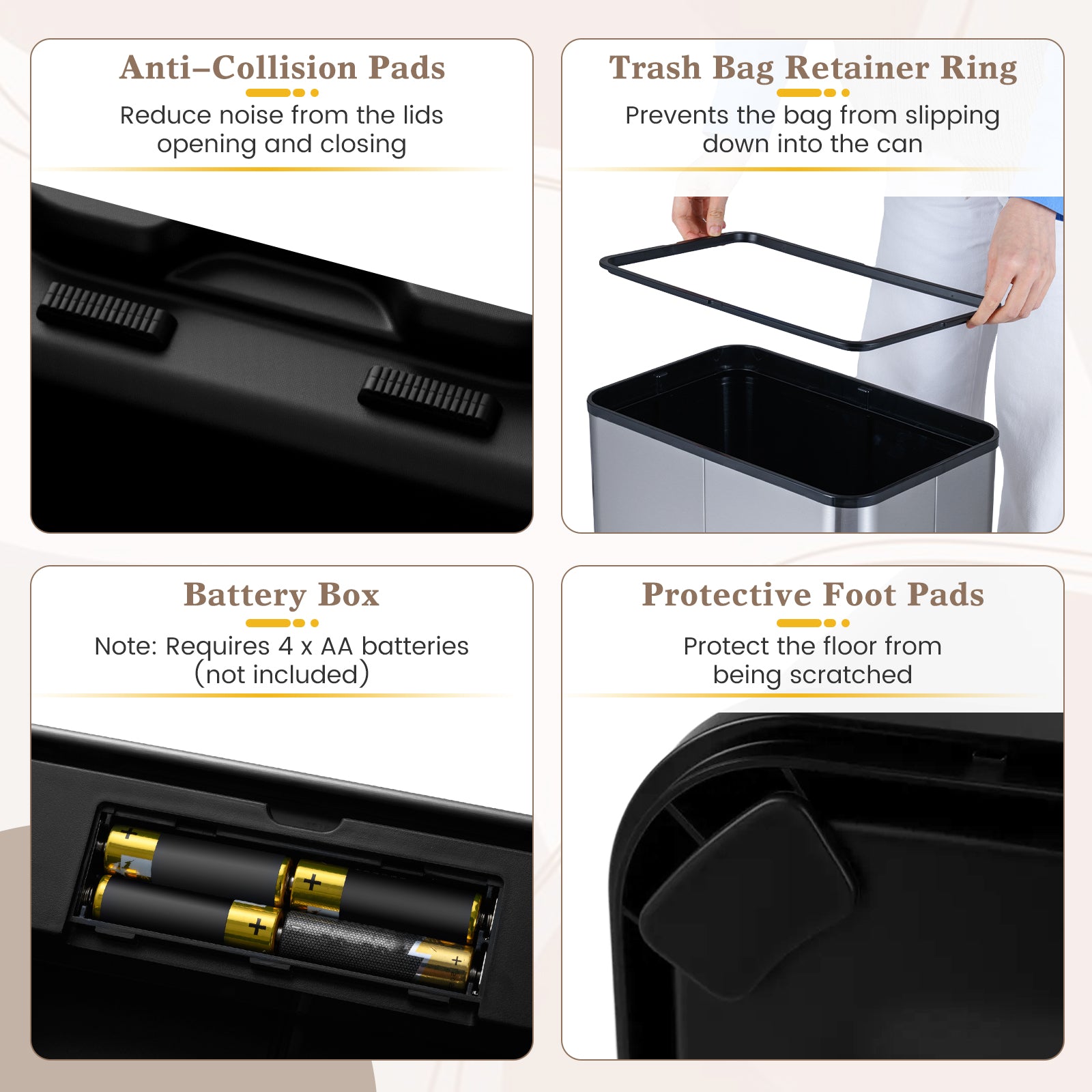 User-Friendly Details: The motion sensor trash can is equipped with a trash bag retainer ring that keeps bags securely in place, protective foot pads to prevent scratches, and even comes with a pair of gloves for mess-free bag changes. Powered by 4 AA batteries (not included), it is simple to maintain and built for everyday ease.