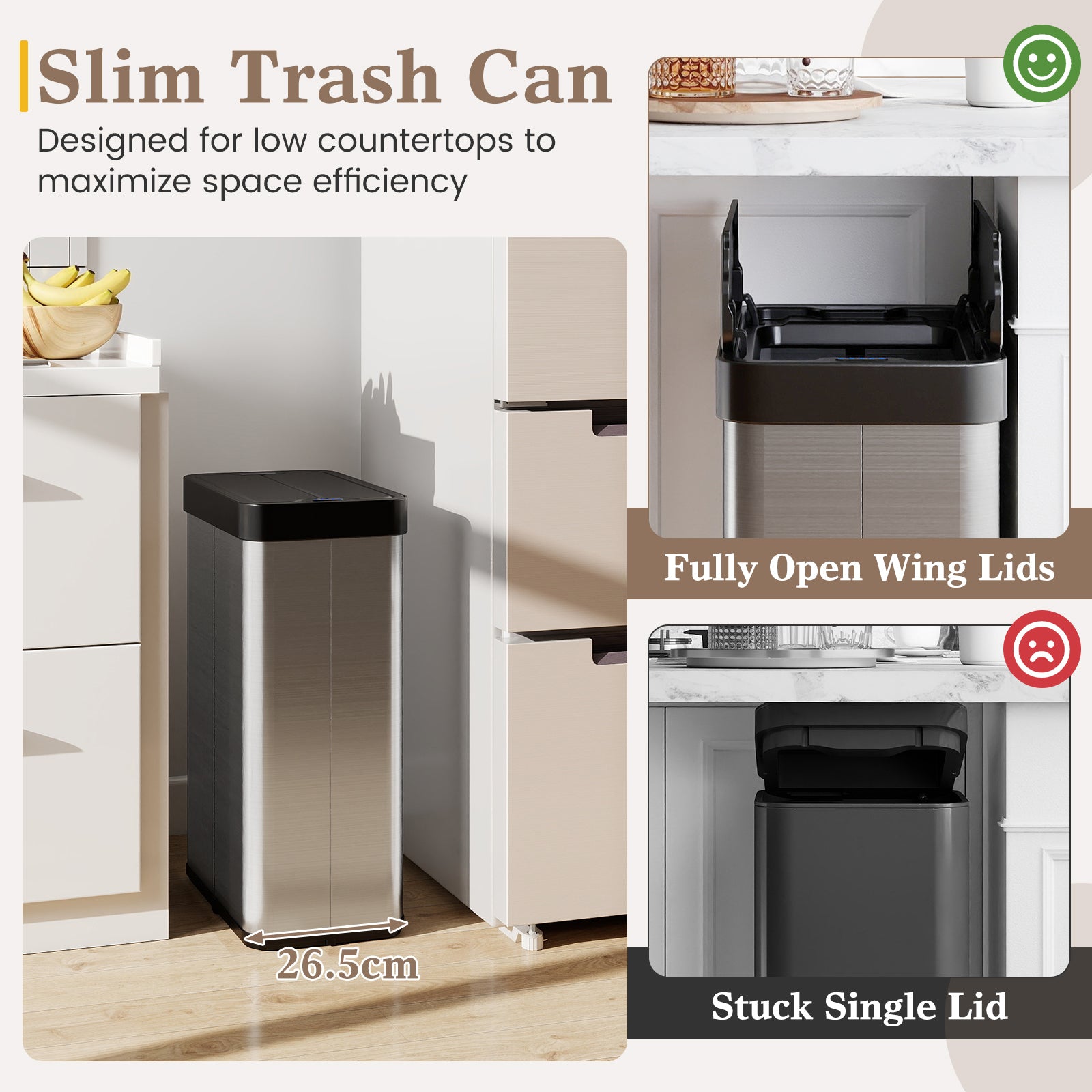 Space-Saving Wing Lids & Slim Profile: Featuring innovative wing lids, the garbage can fits seamlessly under low countertops while its slender 26.5cm width allows it to blend into various rooms without occupying too much space. It is perfect for kitchens, offices, bathrooms, bedrooms, and more.