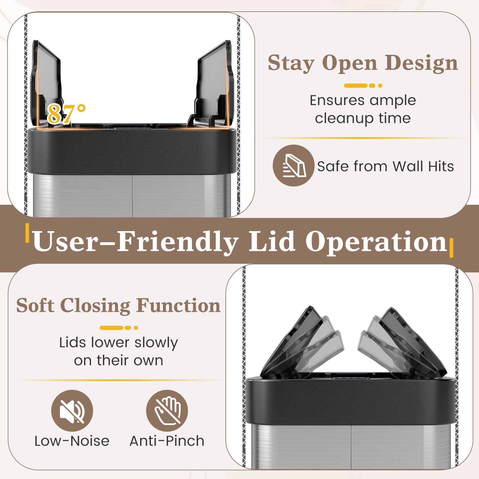 The fully open wing lids prevent the stuck single lid issue, allowing smooth and user-friendly lid operation. After opening, the lid ensures 5s automatic closing, keeping your space clean. Designed with an 87° stay-open angle, it is safe from wall hits, while the low-noise and anti-pinch soft-close lid glides shut quietly and securely. Its slim profile fits perfectly under low countertops, making it ideal for kitchens, bathrooms, or offices. Constructed from robust 3-layered stainless steel, this trash can is rustproof, stain-proof, and well-sealed to lock in unpleasant smells effectively. Note: requires 4 x AA batteries (not included). With protective foot pads and a secure trash bag retainer ring, this space-saving bin combines practicality and convenience for everyday use.