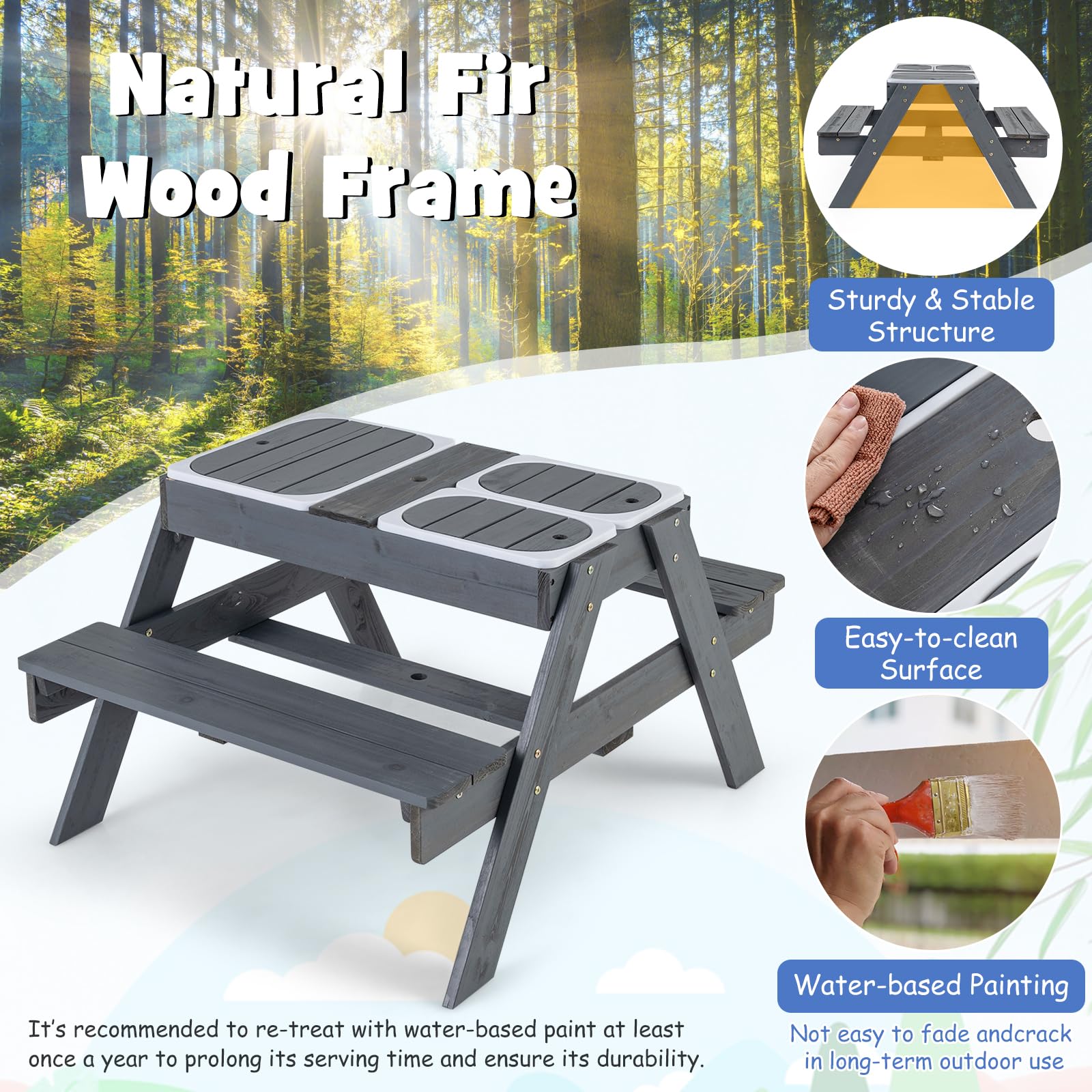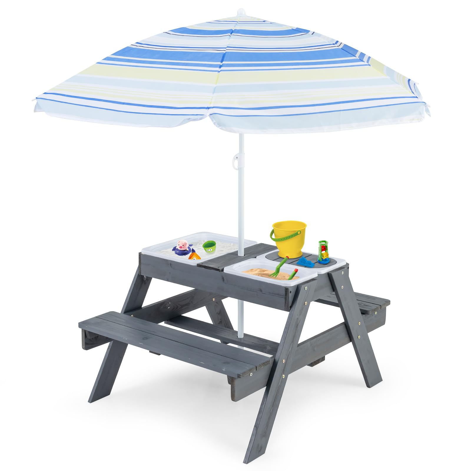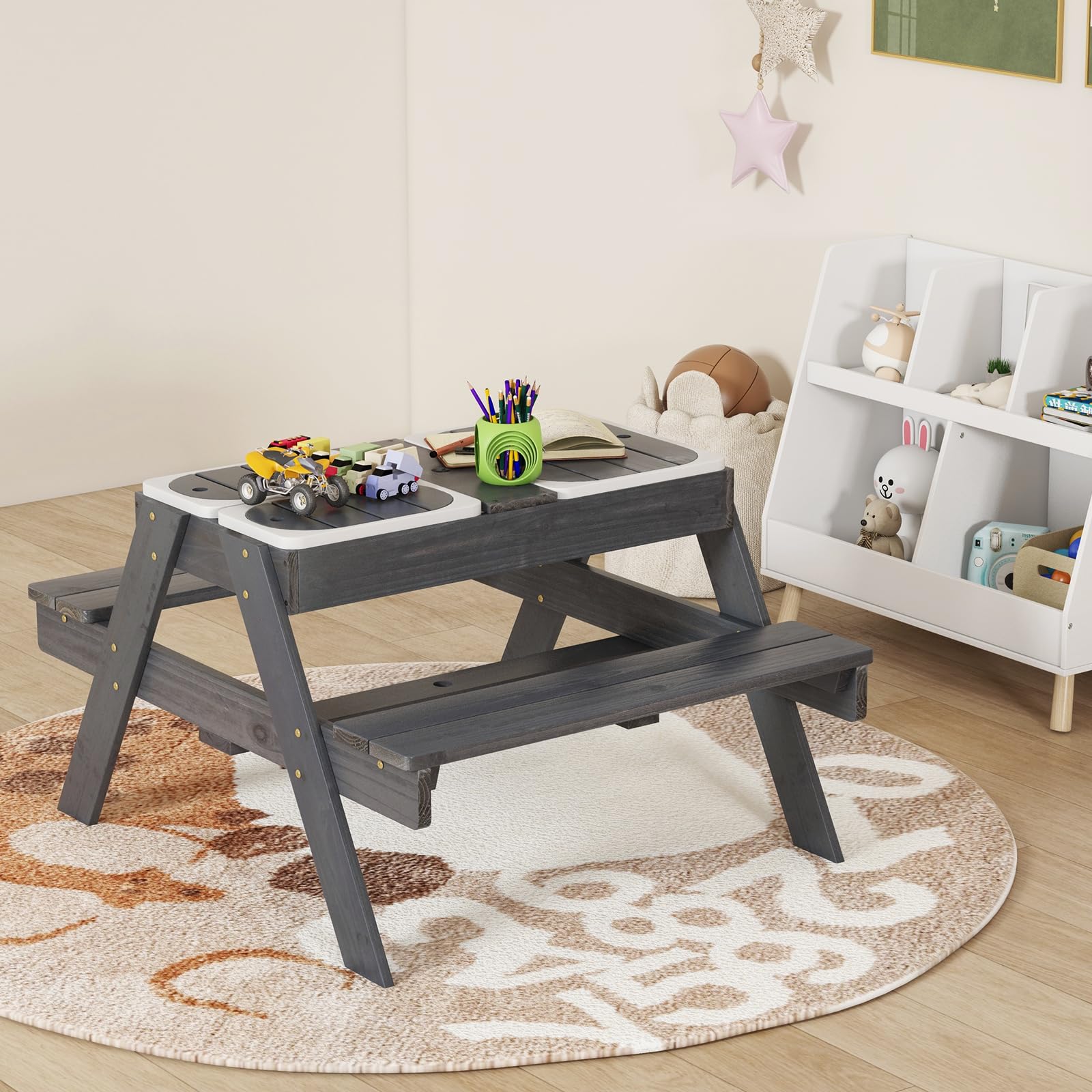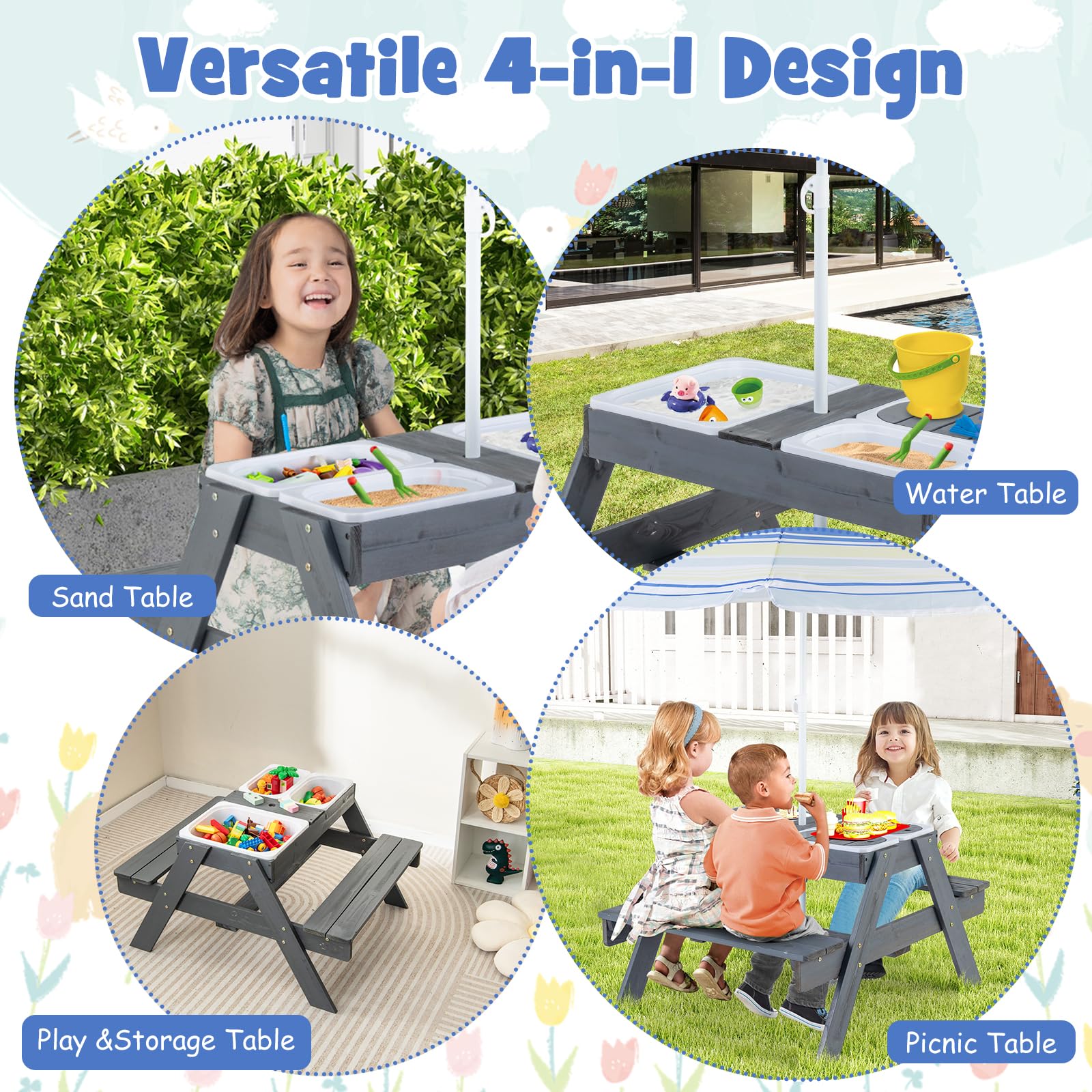 Unlock endless outdoor fun for your child with this multifunctional 4-in-1 picnic table set, which can be transformed into a picnic table, sand table, water table, and storage table.