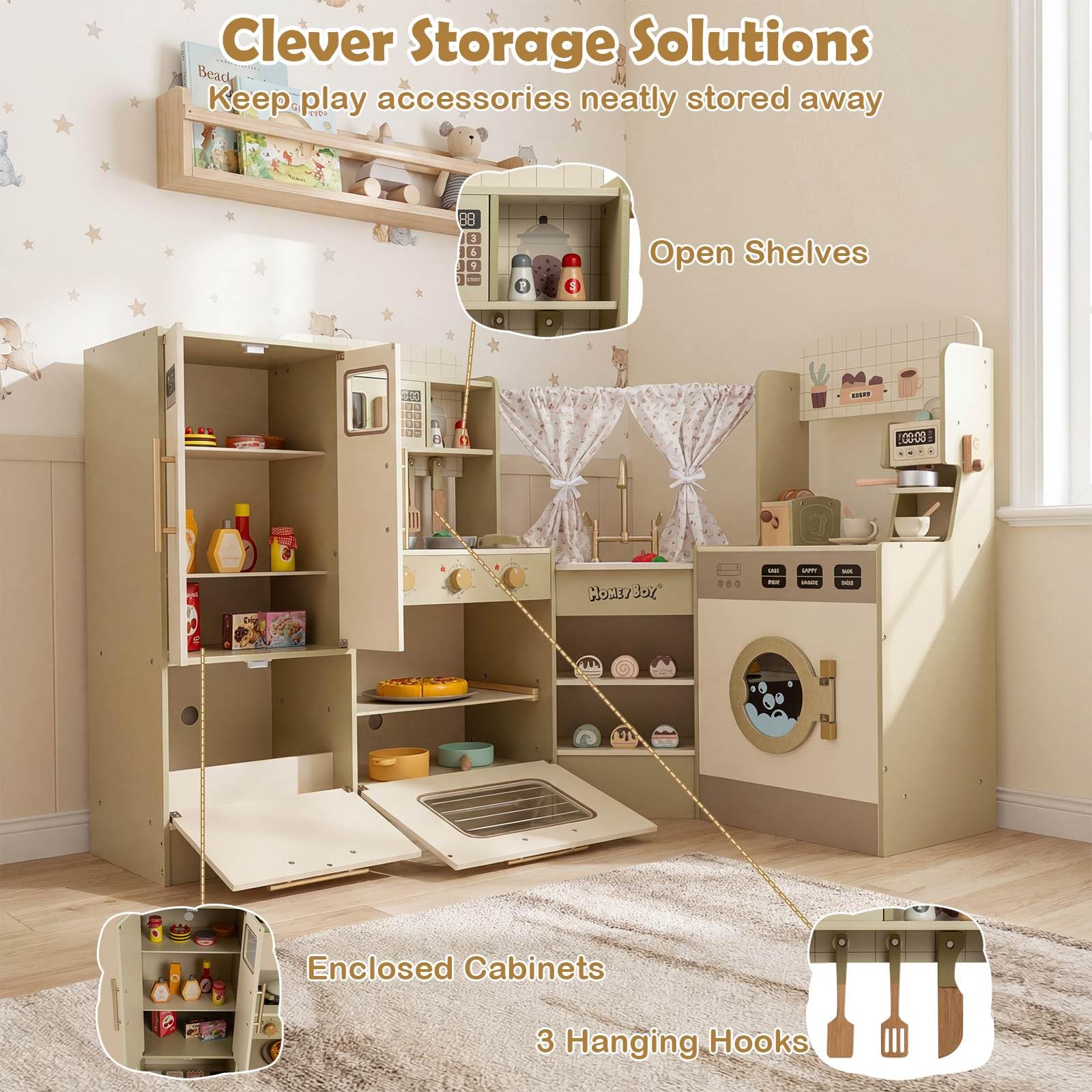 Corner Design & Ample Storage: Maximize playroom space thanks to the smart corner design, which fits neatly in any room while offering clever storage solutions. The pretend kitchen playset comes with enclosed cabinets, spacious shelves, and 3 sturdy hooks.