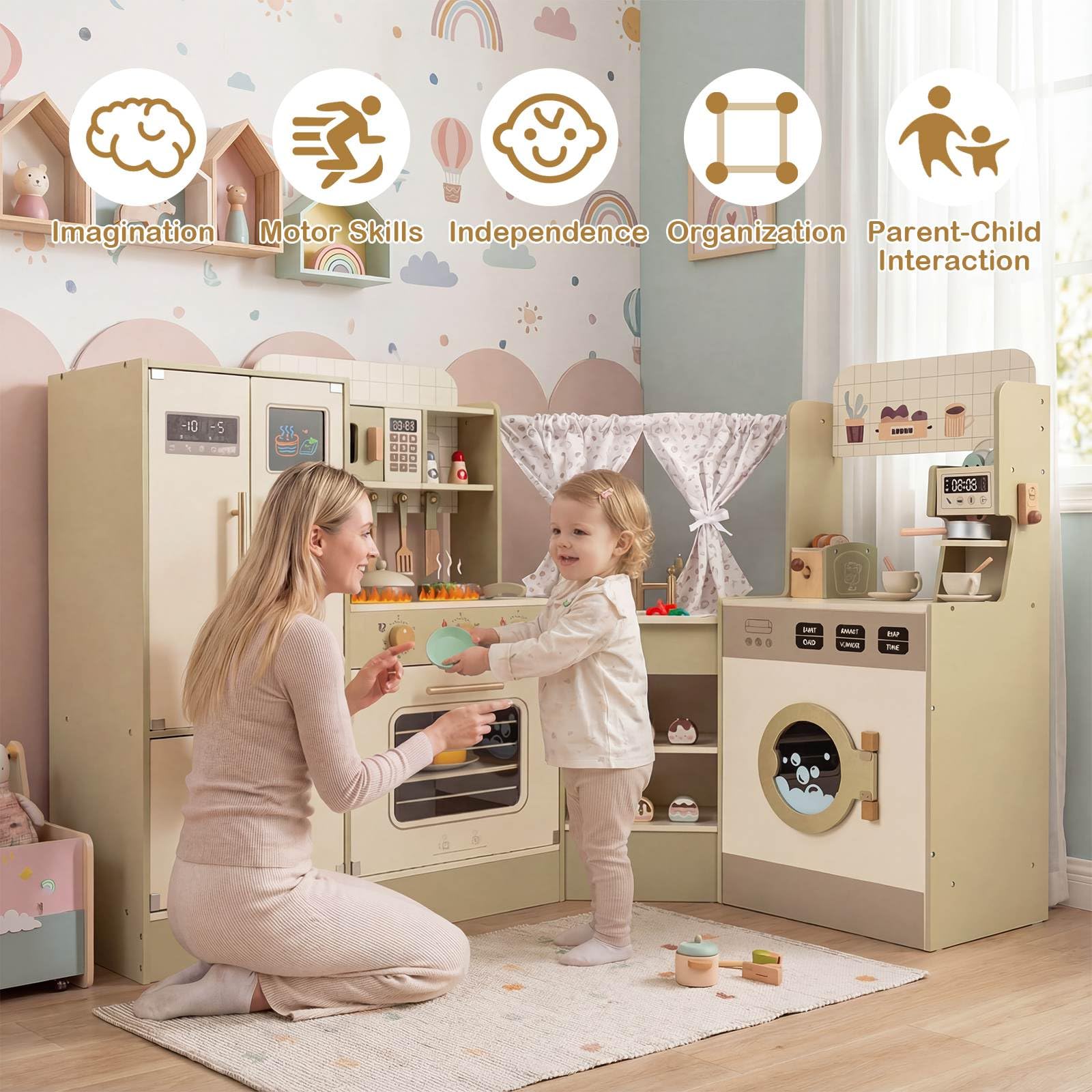 Endless Kitchen Playtime: The Kids corner play kitchen includes a refrigerator, microwave, oven, and toaster, all complemented by 21 adorable accessories. This comprehensive set brings every kitchen adventure to life, letting children mix, bake, store, and serve their favorite dishes.