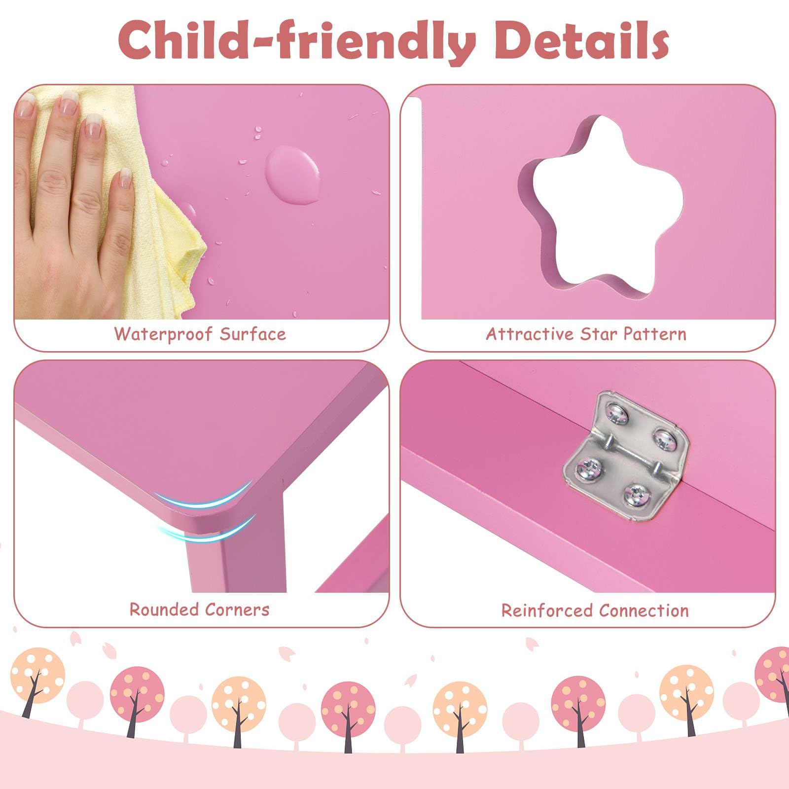 Wide and Smooth Desktop: The wooden children's desk features a spacious desktop that offers kids enough room for a variety of activities. They are able to read, write, eat, do crafts or play games. Furthermore, the smooth surface is easy to clean with a soft rag.