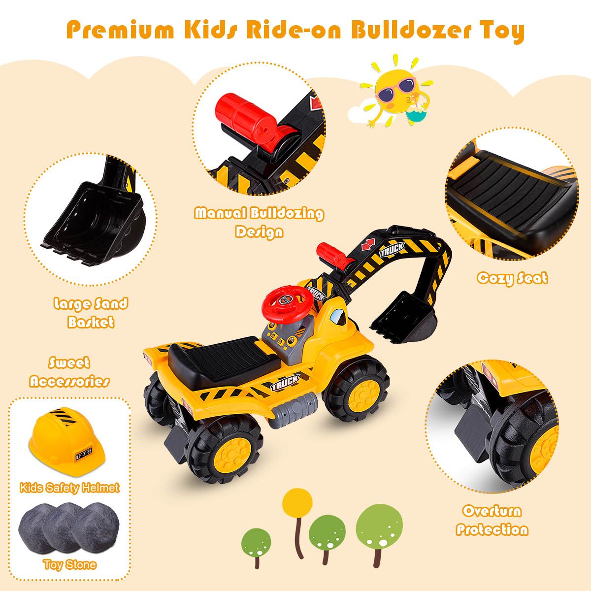 Realistic Riding Experience: Simulating the real excavator, this kids play truck with forward and backward functions greatly satisfies your little one’s curiosity. And the multiple sounds greatly attract his or her attention. The included kids safety helmet and toy stone add extra happiness.