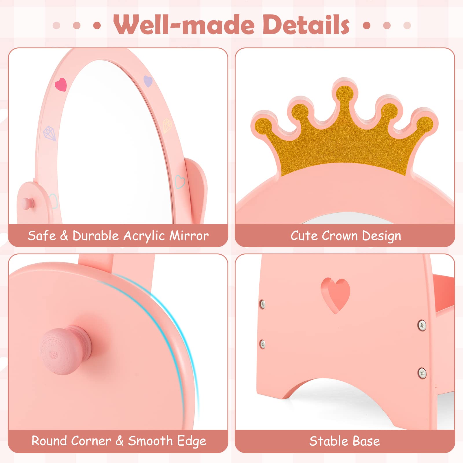Cute and Attractive Appearance: This kids free-standing dressing mirror is in fancy pink, and the top golden crown perfect decorates the whole mirror. Such an elegant design is appealing to kids, and makes the mirror an ideal decoration for kids room.