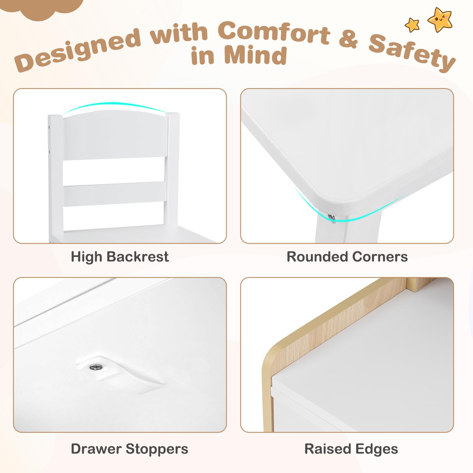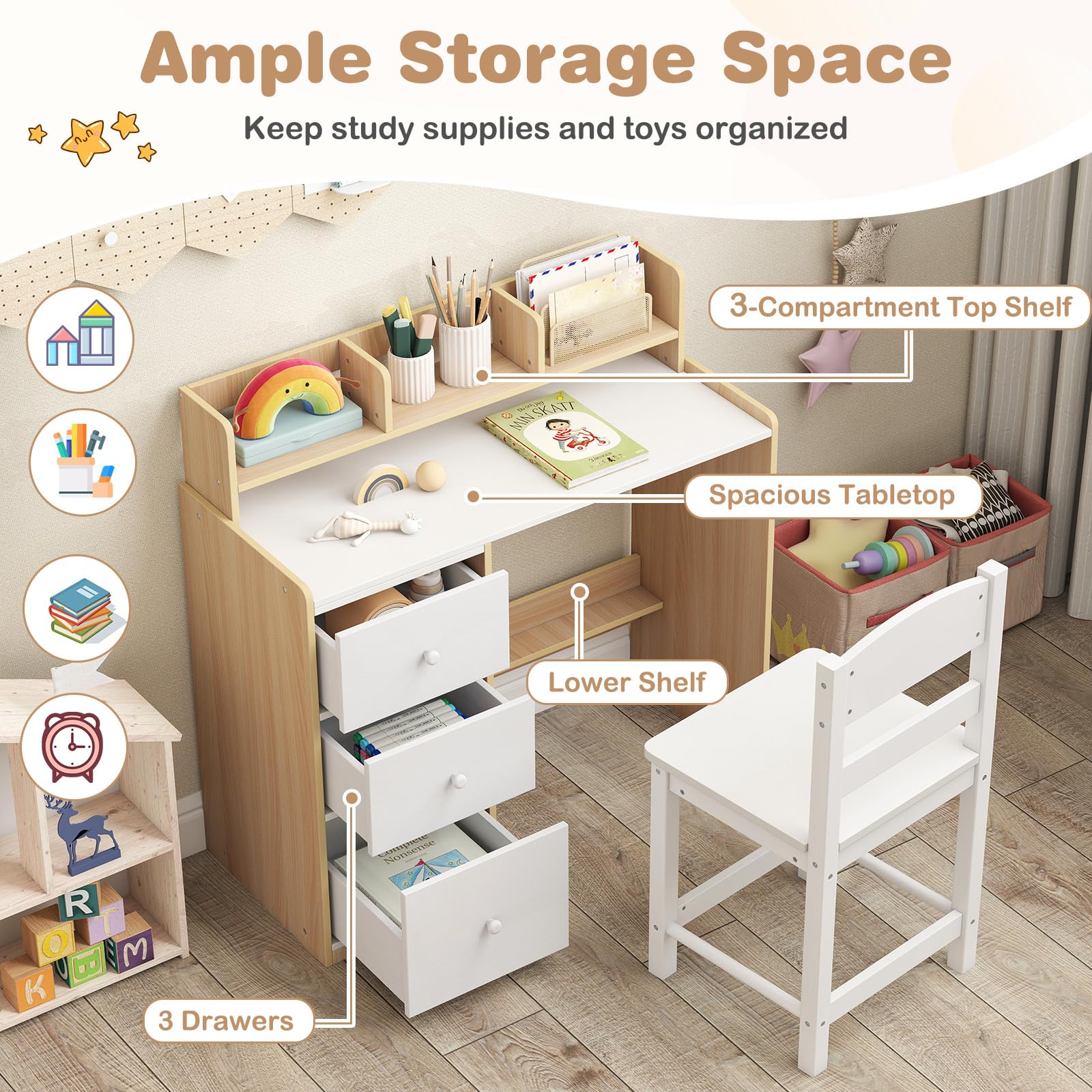 The spacious tabletop offers ample room for writing, drawing, and various projects. Above the desk, a 3-compartment top shelf helps keep books, supplies, and favorite items within easy reach, while 3 drawers and the lower shelf provide organized storage for smaller materials. Crafted with solid pine wood legs and reinforced with birch wood crossbars, this study table and chair set provides stable support and durability. Designed with comfort and safety in mind, the set includes a high back chair, an anti-toppling device and rounded corners.