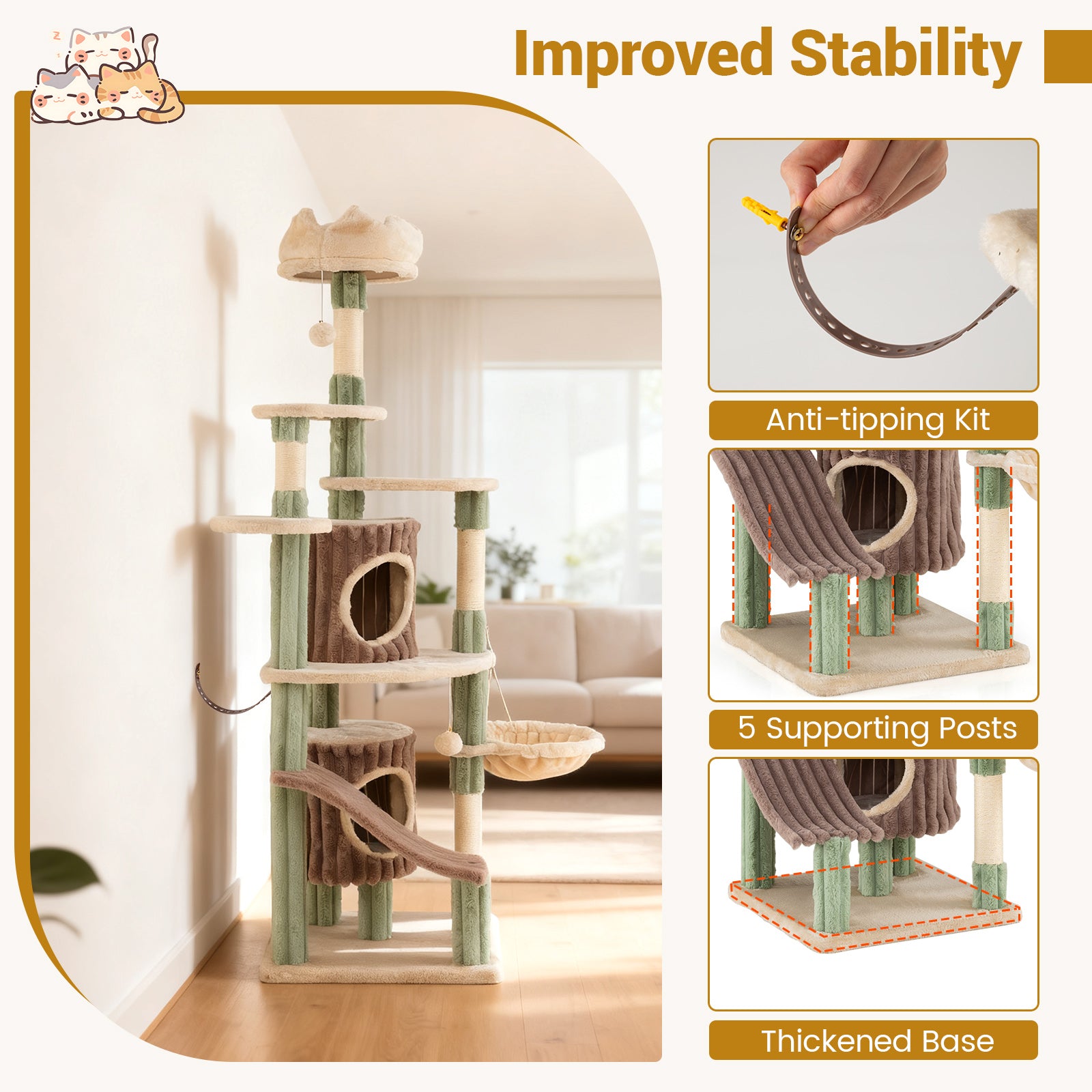 The multi-level kitty tower is designed to cater to your feline friend's every need. The crown-shaped top perch features thick filling. Hence, it will create a regal spot for your cat to oversee their kingdom in comfort, while the rotatable basket bed provides a comfy spot for cats to take a nap. With 2 striped condos for hiding and resting, your cats can lounge in style. The sisal scratching posts offer a lasting solution to maintain cat's claws. Moreover, the cat tree will encourage your cat's playful nature and add more fun with hanging balls that make a jingling sound and a slide-style ramp. The thickened base and 5 supporting posts ensure increased stability, while the ultra-soft plush fabric pampers your beloved pet with a luxurious touch. Furthermore, the anti-tipping kit will avoid the large cat climbing frame tipping over.