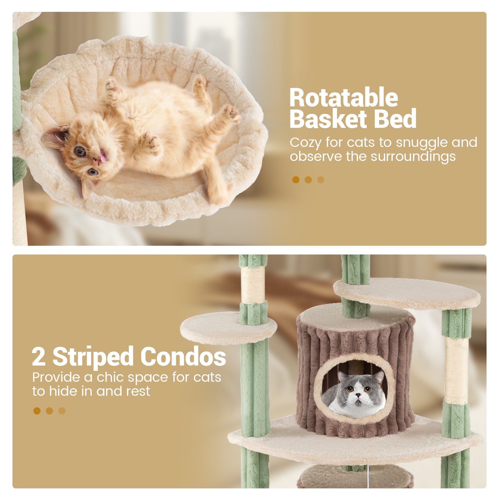 Comfy Resting Spots: Featuring a cushioned crown top perch, cats can luxuriate and survey their domain. With 2 snug cat condos and a cozy basket bed, the tall cat tree offers a range of resting places at different heights to cater to cats' lounging preferences.
