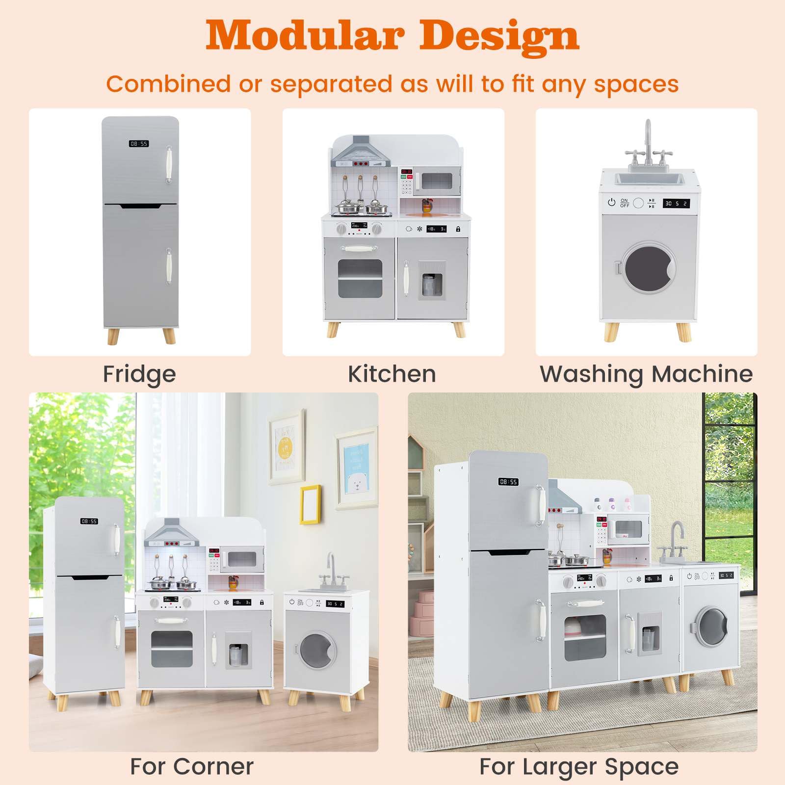 Functional Modular Design: The children's play kitchen features a refrigerator, a kitchen set, and a washing machine with a sink. Each module is independent, allowing you to rearrange them as will. Therefore, the pretend kids kitchen is suitable for larger space or limited corners.