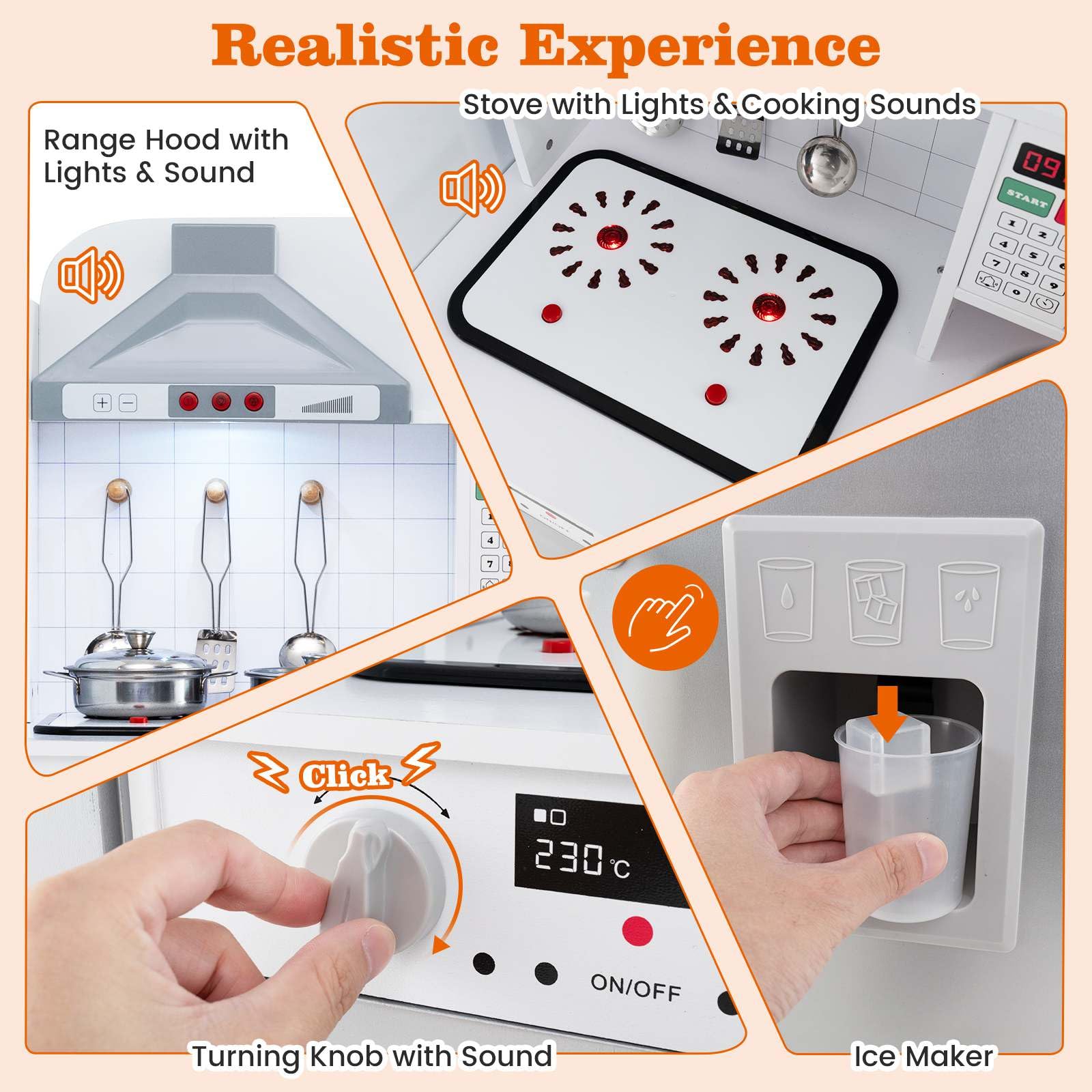 Realistic Role-playing Experience: With 2 light-up simulated stove tops, a light-up hood with real sounds, rotary knobs with “click” sound, the modular play kitchen offers immersive cooking experience. Plus, the inclusion of microwave, oven, ice maker, washing machine, sink with rotary faucet will offer added enjoyment for kids.