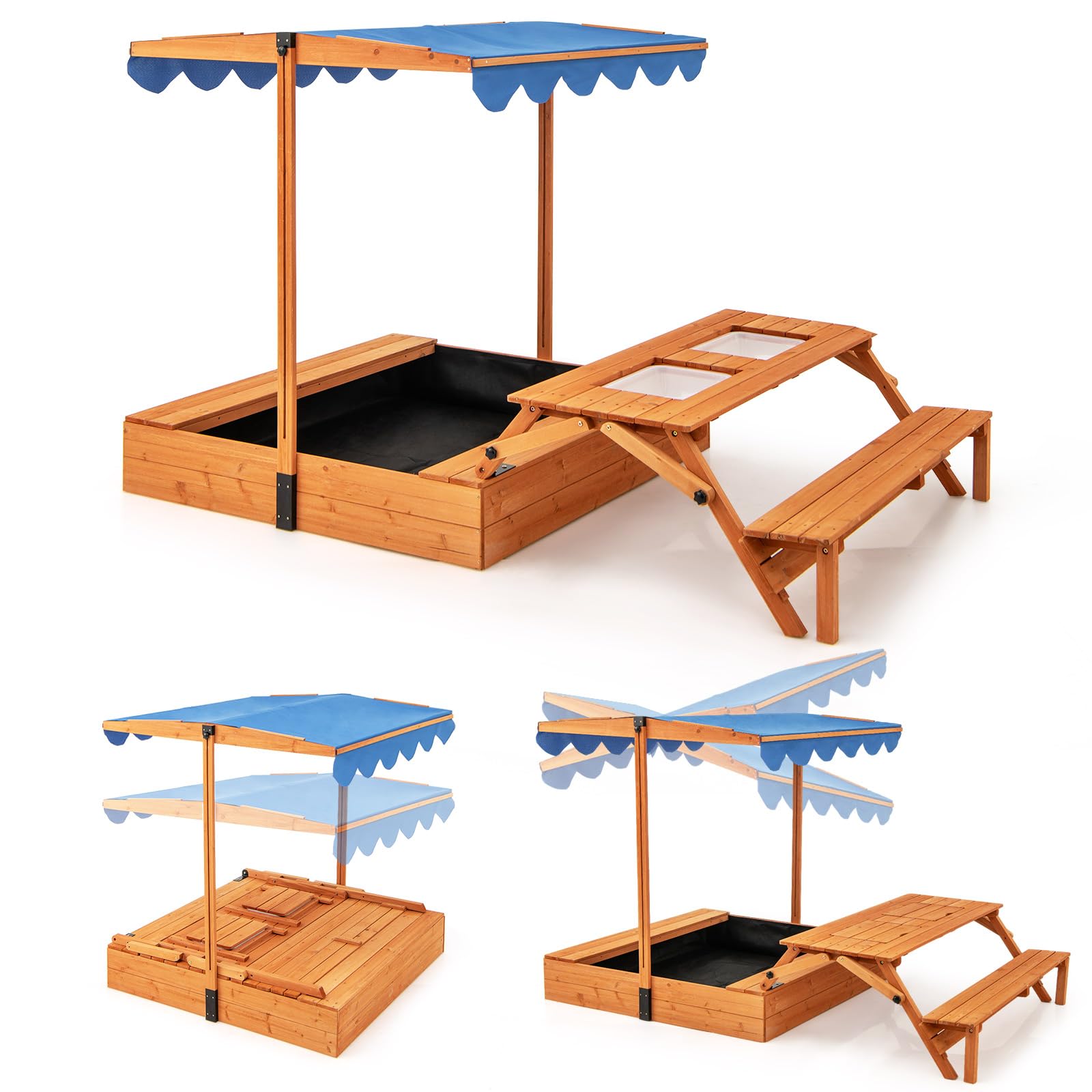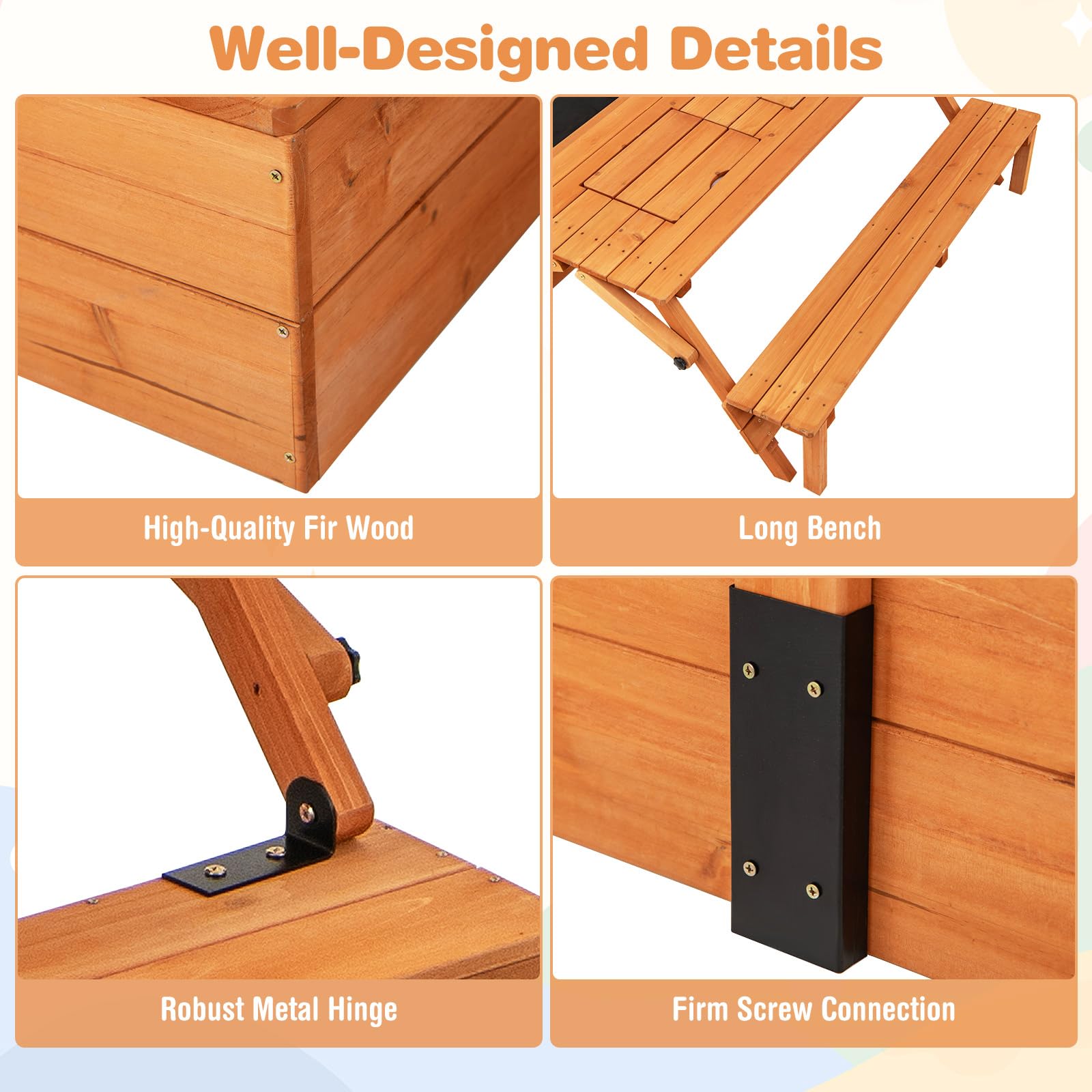 3-in-1 Multiple Fun: Engage your child in various activities with this versatile playset featuring 2 removable covers and 2 bins. The sandbox offers large area for kids to play sand, which also doubles as a sensory table to play water or sand and a picnic table to enjoy food and drinks.